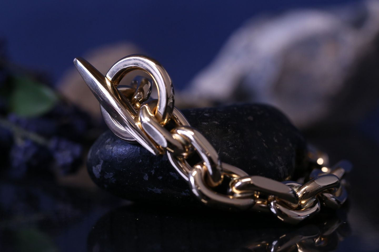 When you stand with this gold bracelet, you realize it is something very special. The simple design of large links, combined with the special lock, gives this bracelet a very special expression. Timeless, exclusive and elegant. The design in solid gold gives the bracelet a considerable weight, which raises the bracelet to a very exclusive level.
