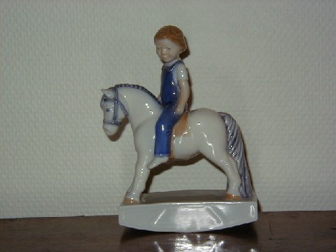 Rare Royal Copenhagen Figurine, Boy sitting on rocking horse, decoration number 5651, factory third, measures 17.5 by 13 cm. Perfect condition.