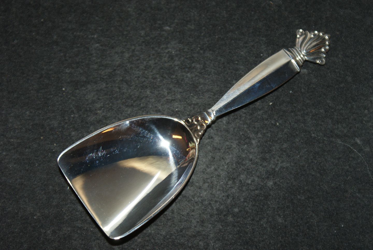 Sukker skovl 1931 # 172 Dronning / Acantus #180 with engraving Georg Jensen Sølvbestik Længde 10,5 cm. Flot og Velholdt Stand. Alt bestik er poleret og pakke i pose
