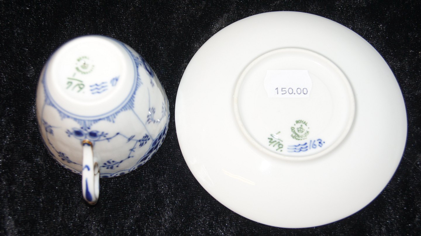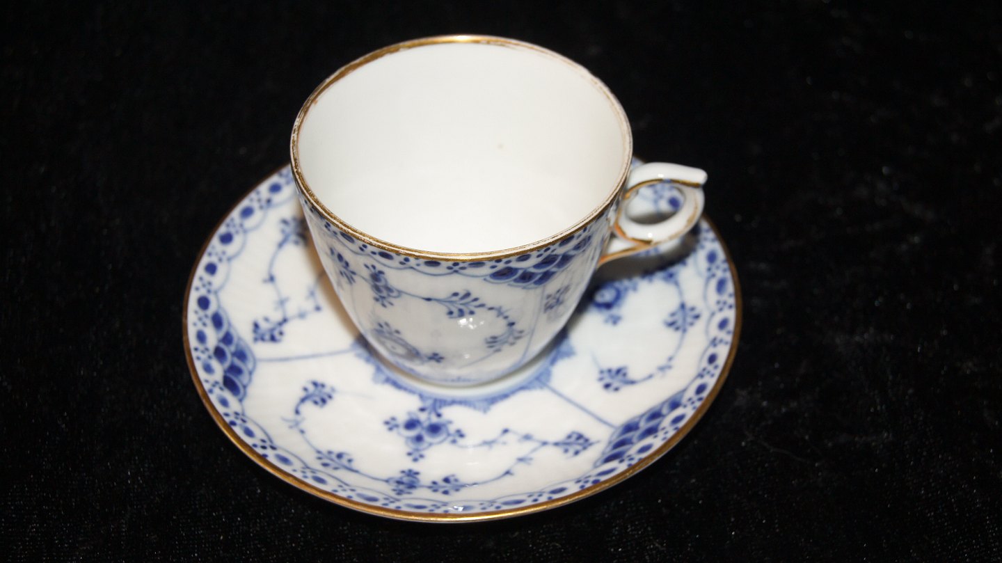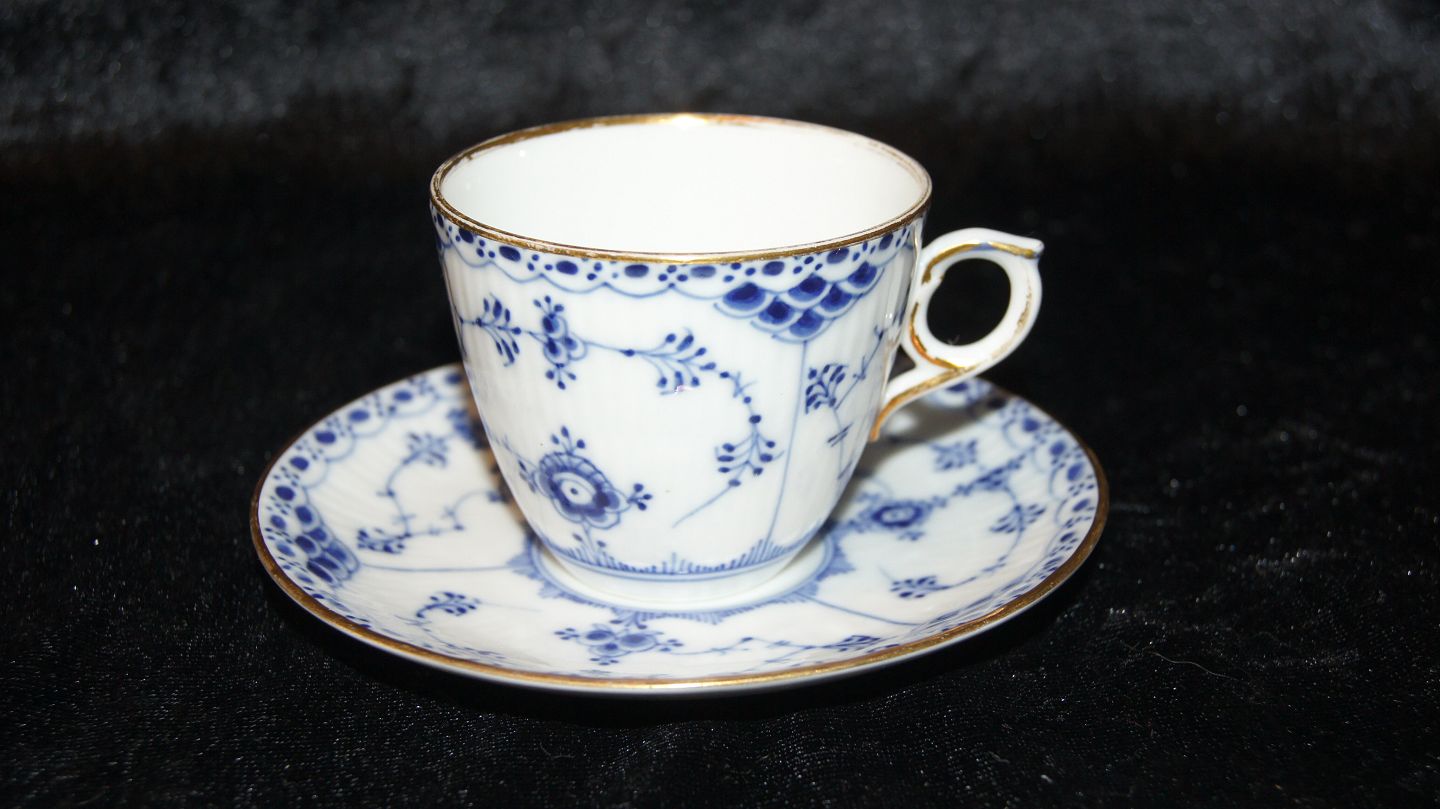 Royal Copenhagen Mussel #Half blonde with gold edge #Coffee cup and saucer