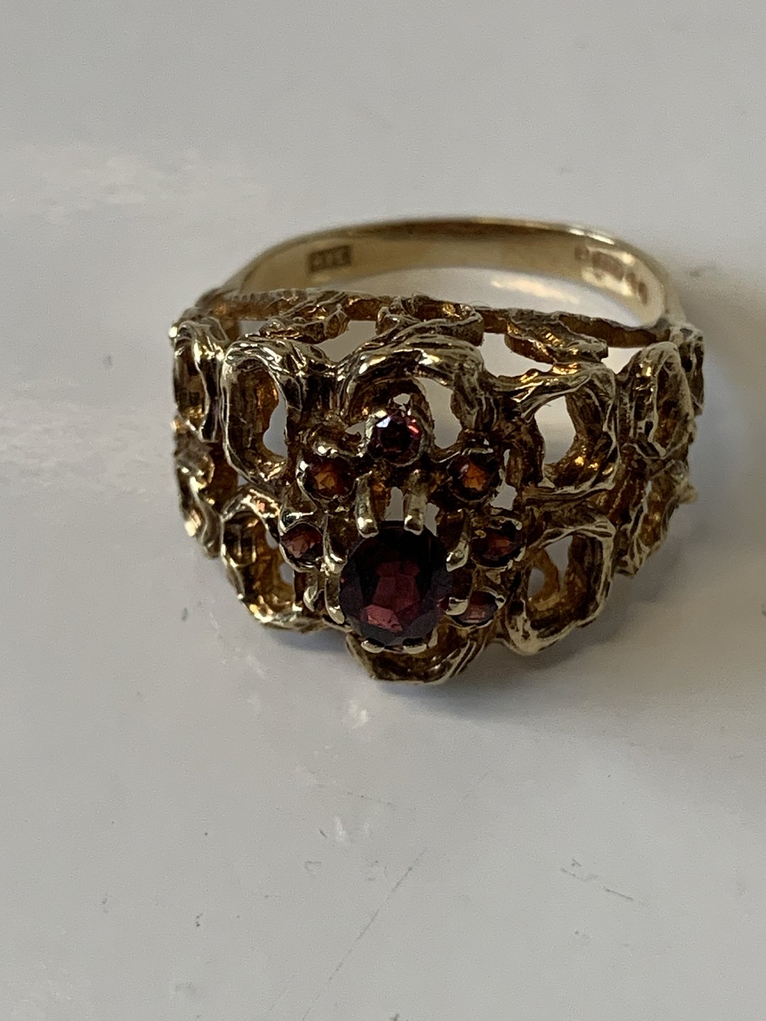 9 carat Gold Ladies Ring with Red Garnets Stamped HIE 375 Size 56 Nice and well-maintained condition Checked by jeweler and it is not physically available in our store, so contact us for information