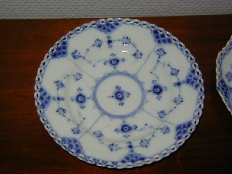 Royal Copenhagen Blue Fluted Full Lace Cups on feet and full lace sideplates. The cups and saucers have number 1/1037 and the sideplates have number 1/1088. We have six set and the price is for each set. (1 cup, 1 saucer and 1 sideplate).