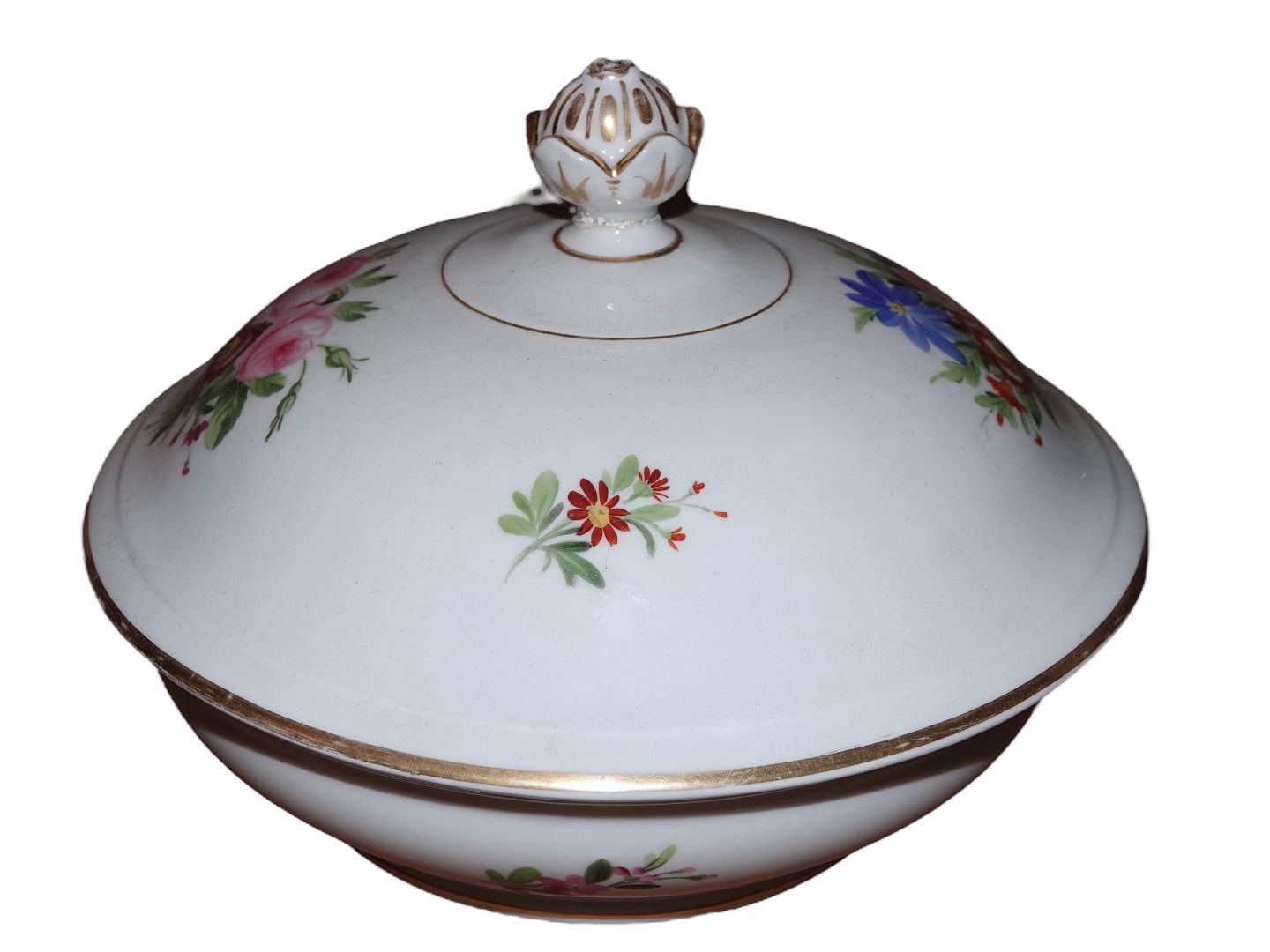 Royal Copenhagen lidded round bowl decorated with bouquets of flowers.