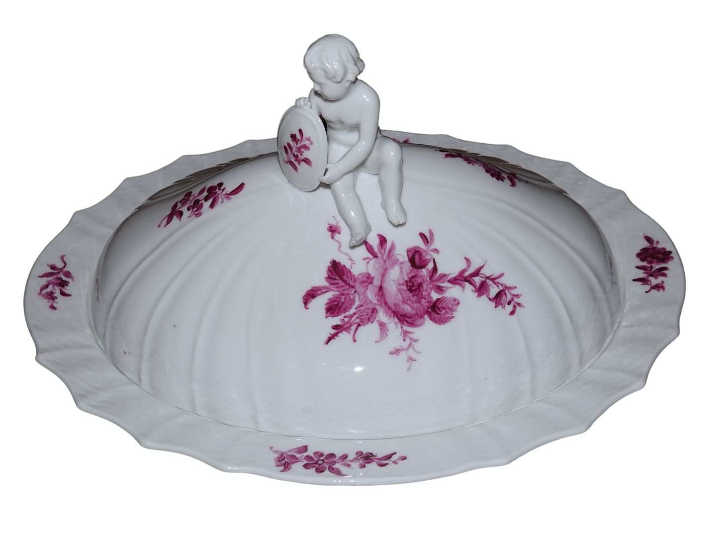 Royal Copenhagen Purpur Flower Curved, large lidded bowl with a putti figurine on the lid.