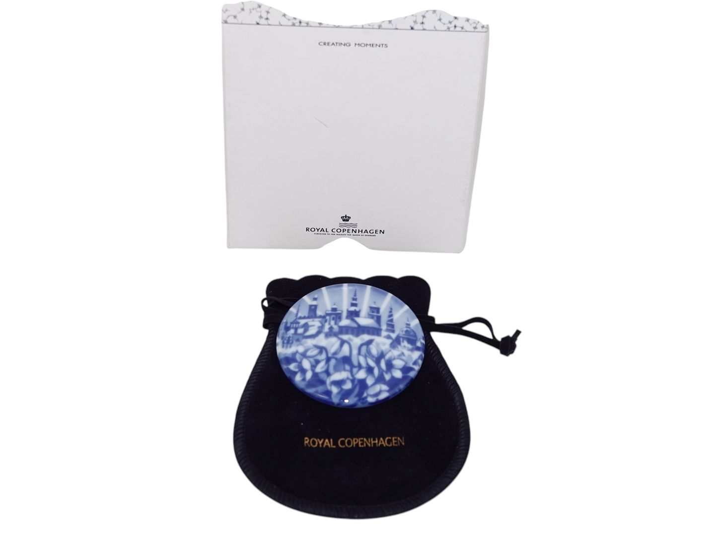 Royal Copenhagen small pocket mirror from 2008 decorated with the towers of Copenhagen and gold edge.