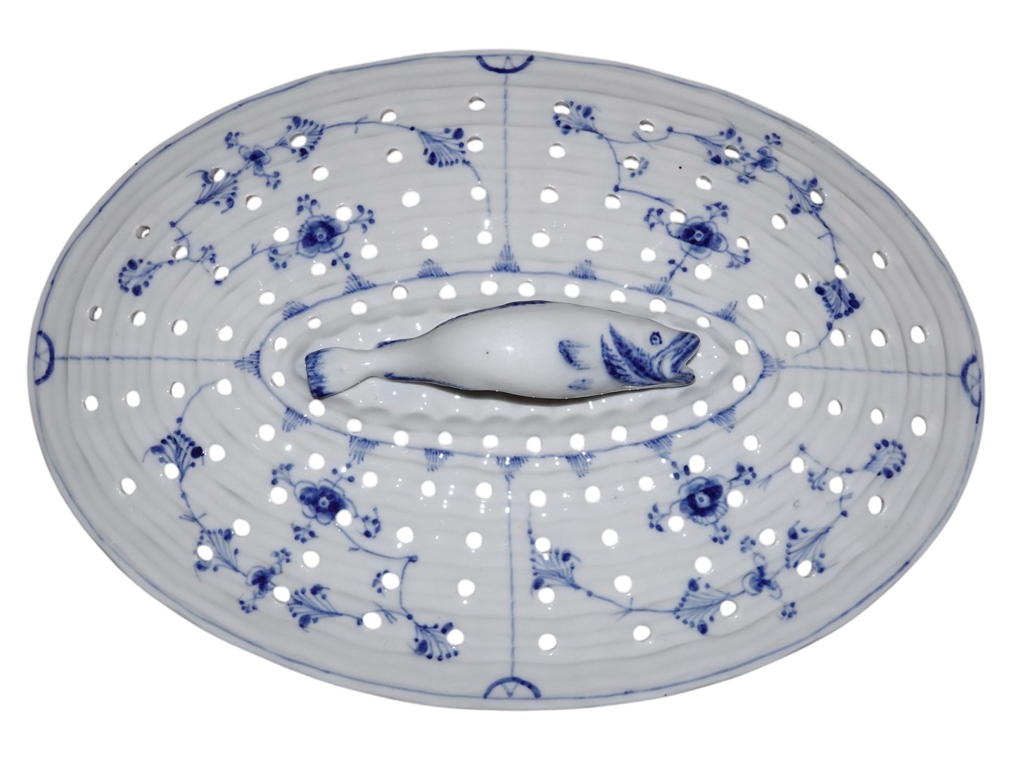 Royal Copenhagen Blue Fluted Plain, rare fish strainer with a fish figurine on top.