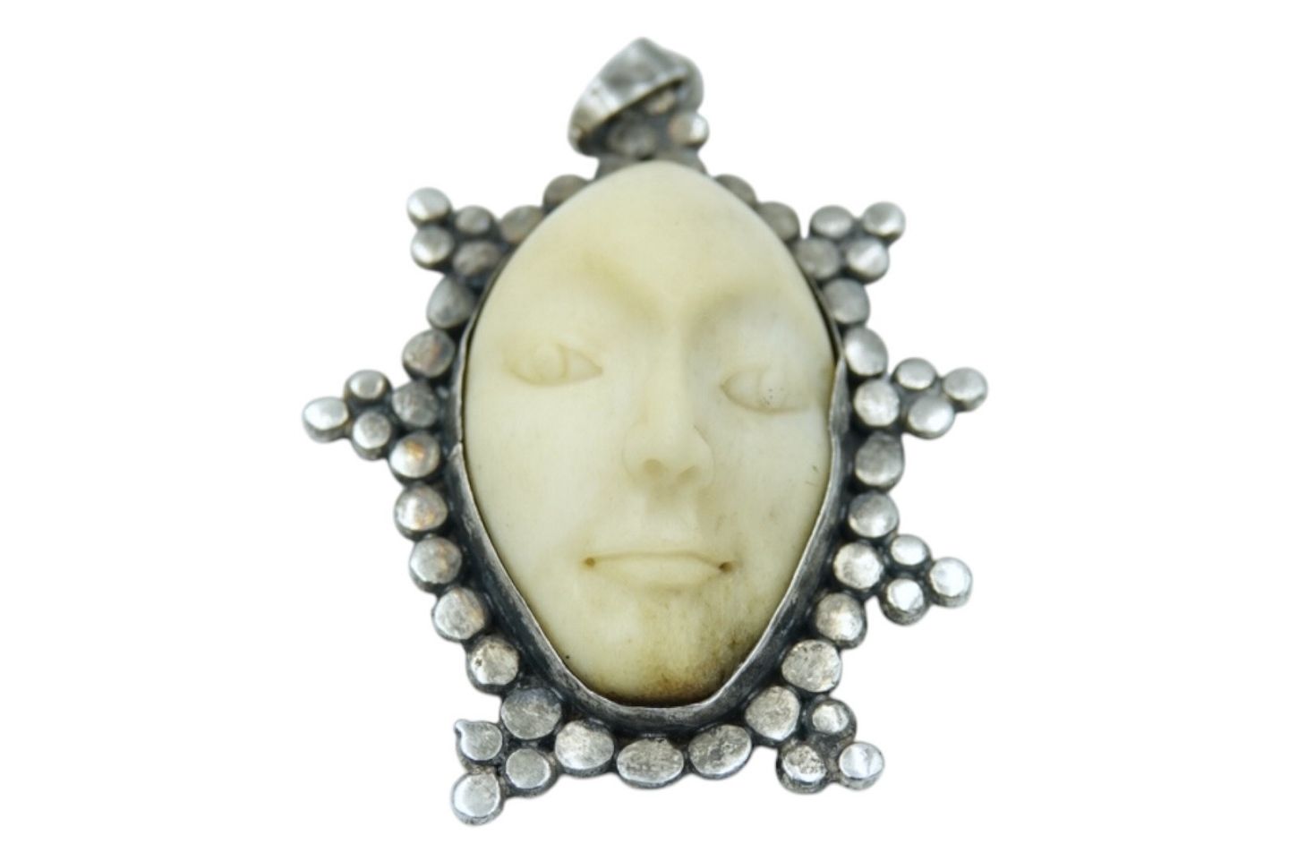 Større sterlingsølv vedhæng med ansigt i ben. Stemplet "925". Måler 4,1 x 3,5 cm. Fin og velholdt stand.