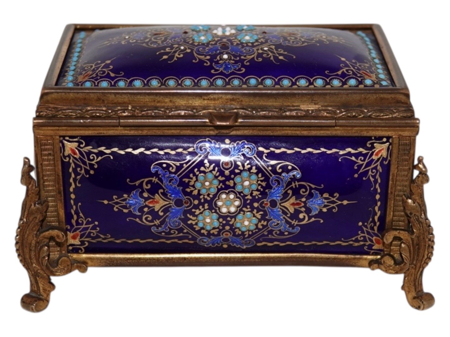 Smykkeskrin i forgyldt bronze med mørkeblå Sevres lignende emalje.