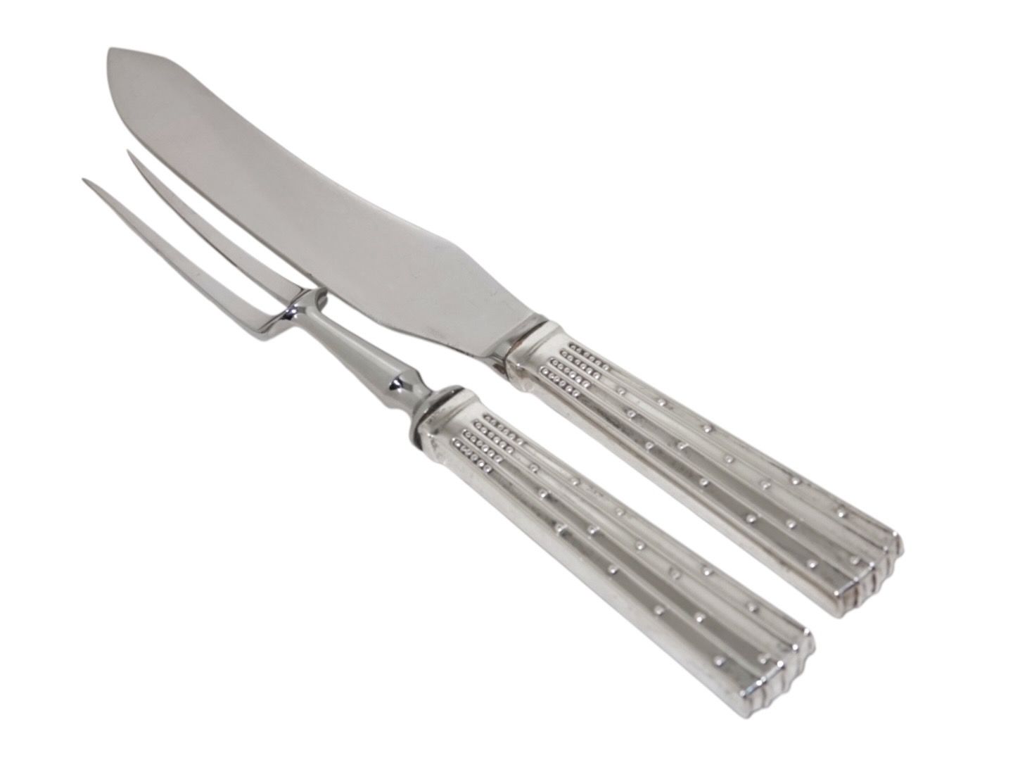 Champagne silver and stainless steel, meat carving set. Designed by Jens Harald Quistgaard and made at silversmith O.V. Mogensen. Length 24.0 and 29.0 cm. Excellent condition without engravings.