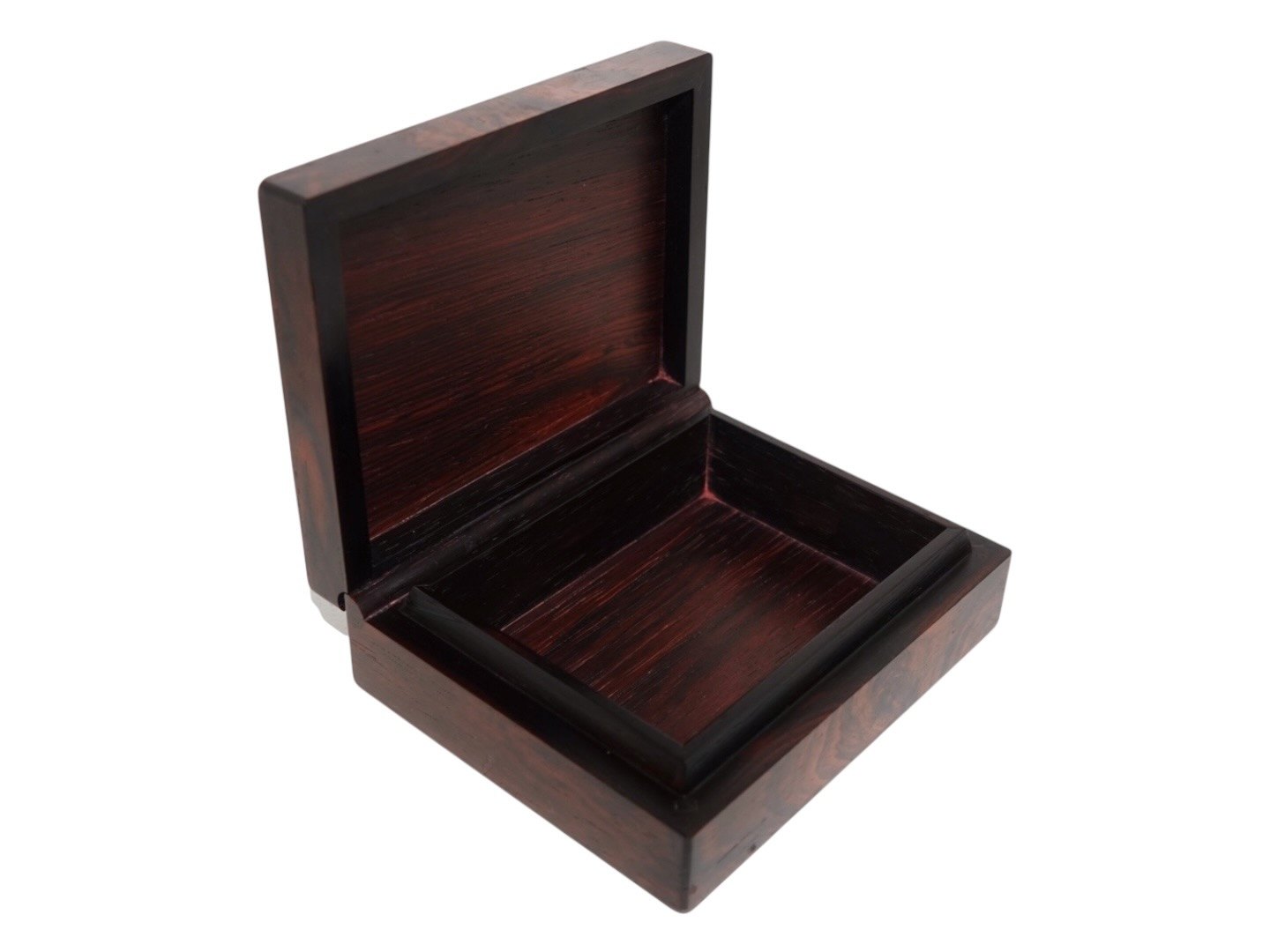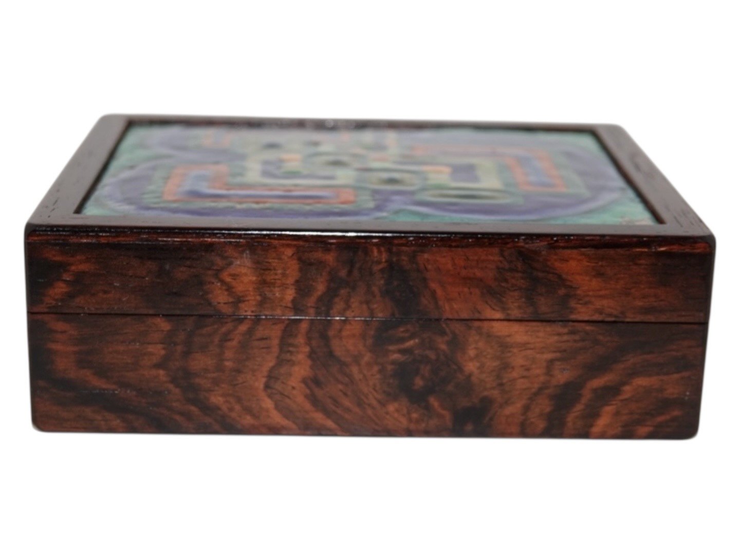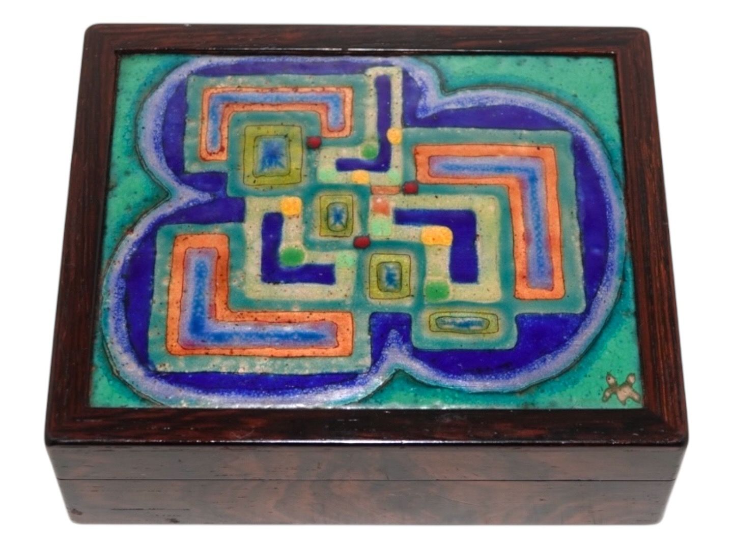 Alfred Klitgaard, lidded rose wood box with Bodil Eje enamel. Marked "KLITGAARD DENMARK". Measures 11.4 by 9.4 cm., height 3.7 cm. Excellent condition. Very well kept.