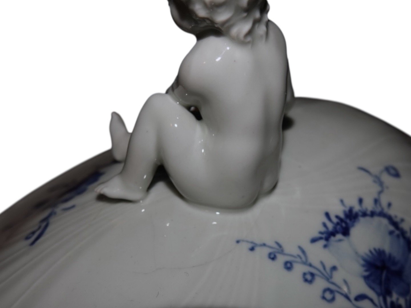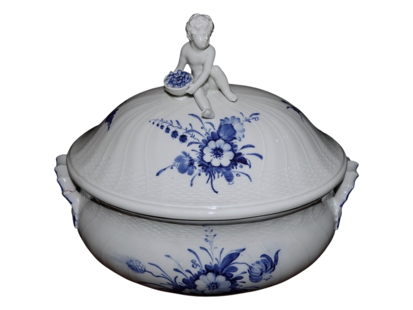 Royal Copenhagen Blue Flower Curved, extra large soup tureen with a boy figurine on top. It is an early piece that is grey in the porcelain instead of white.