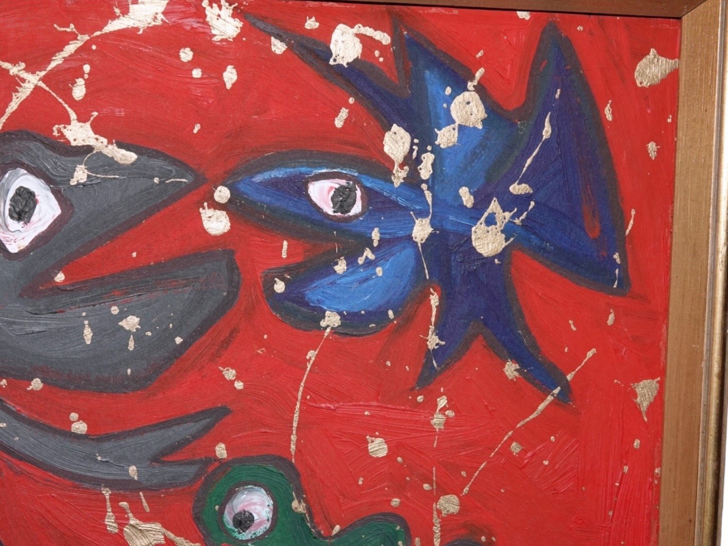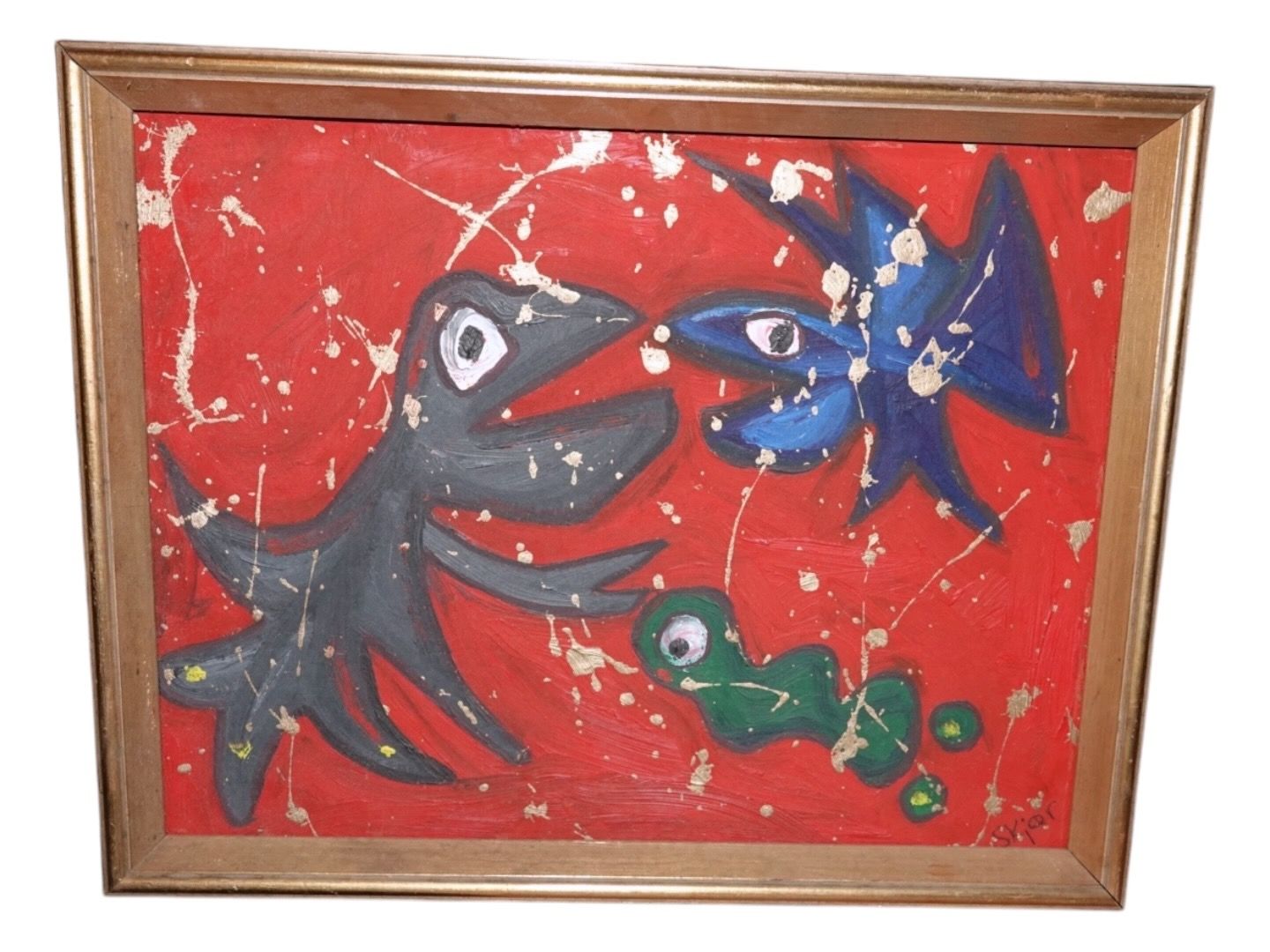 Susanne Kjær, modern red oil painting with fish.