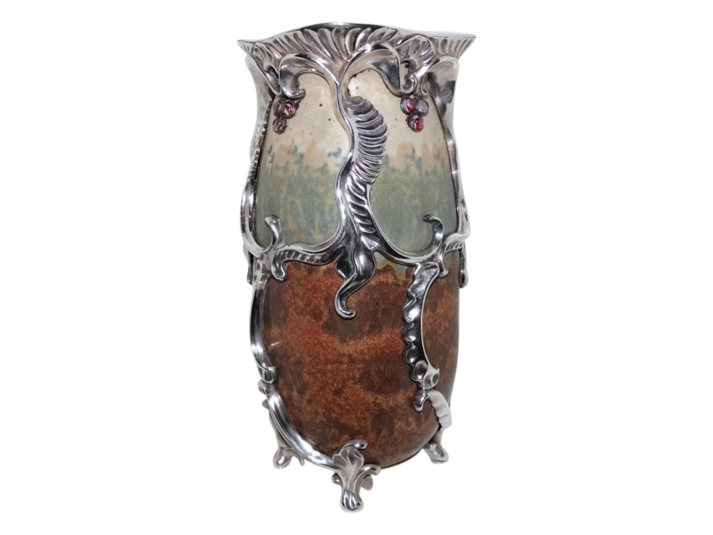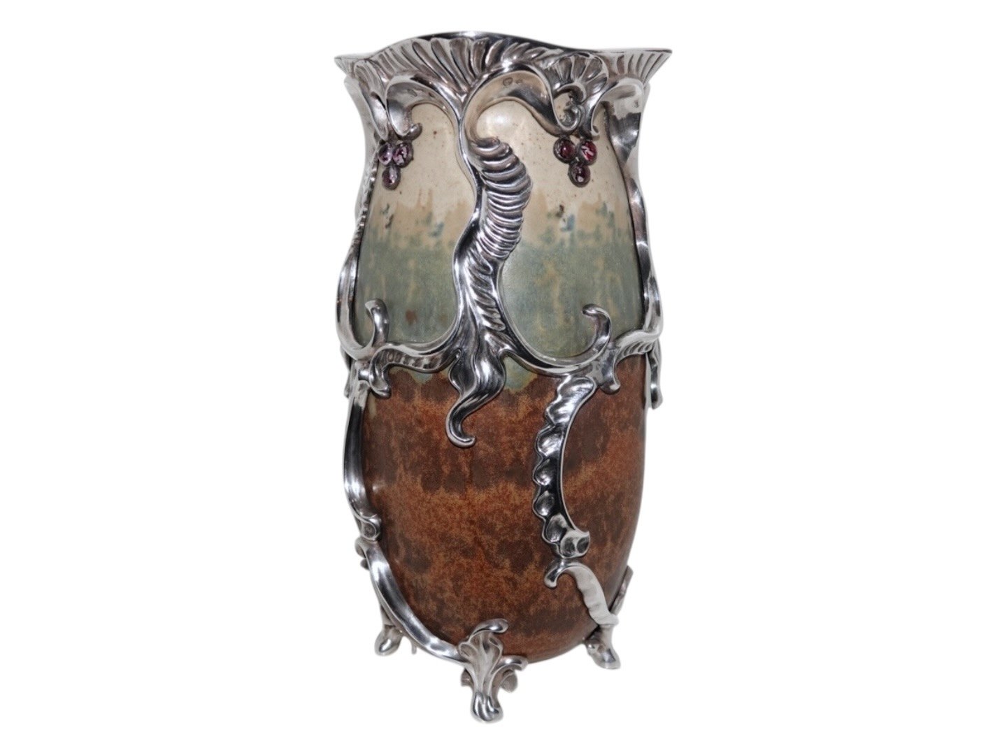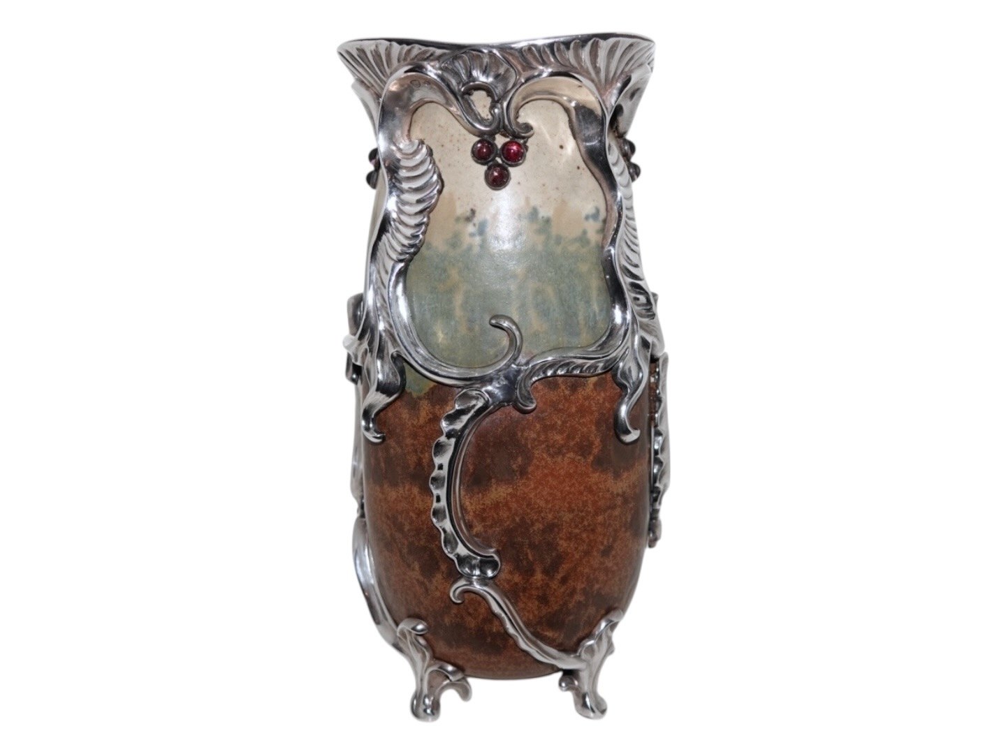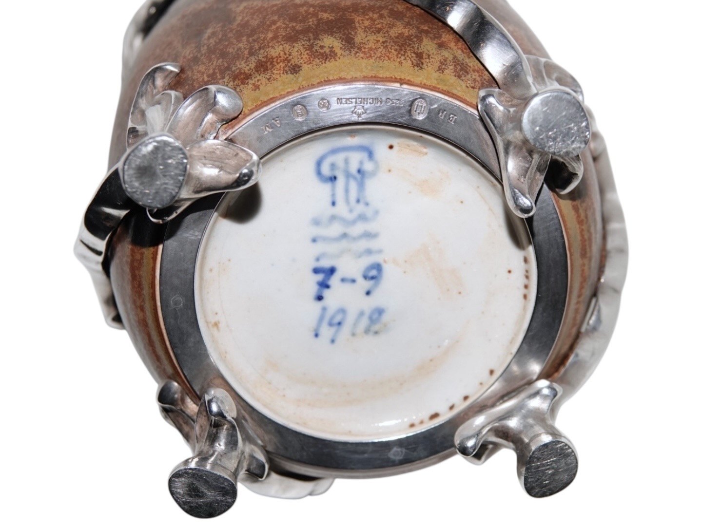 Royal Copenhagen art pottery, large and unique vase by Patrick Nordström with original, extravagant and heavy silver mounting and amethysts.