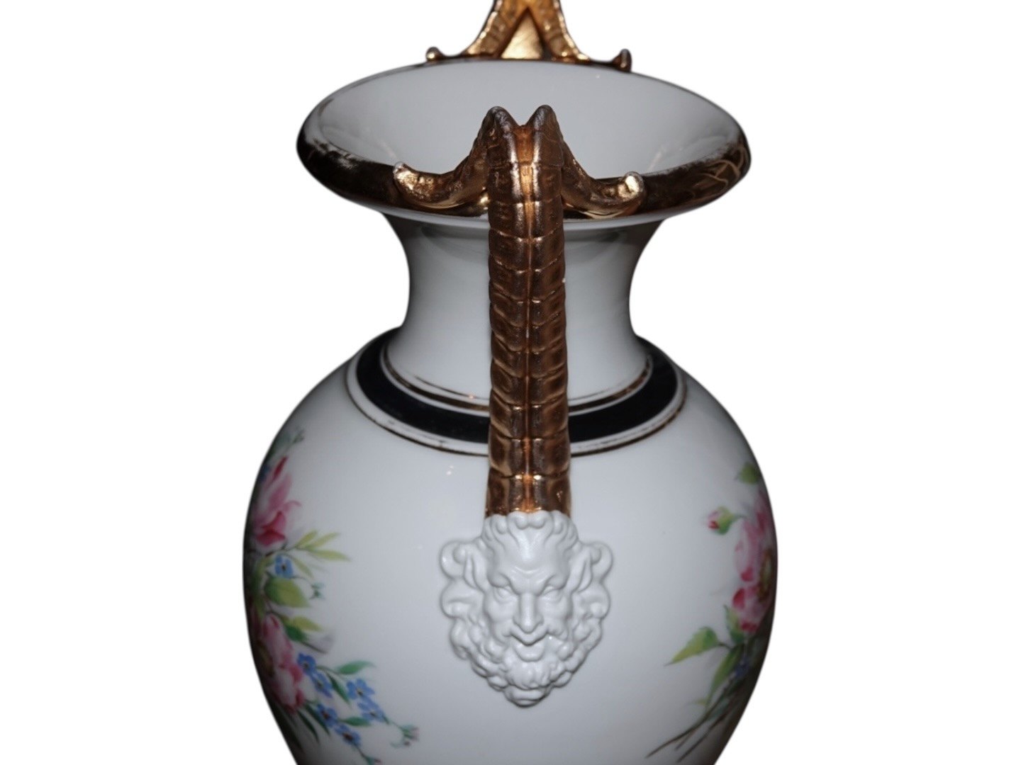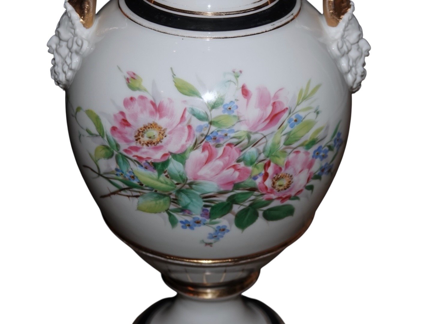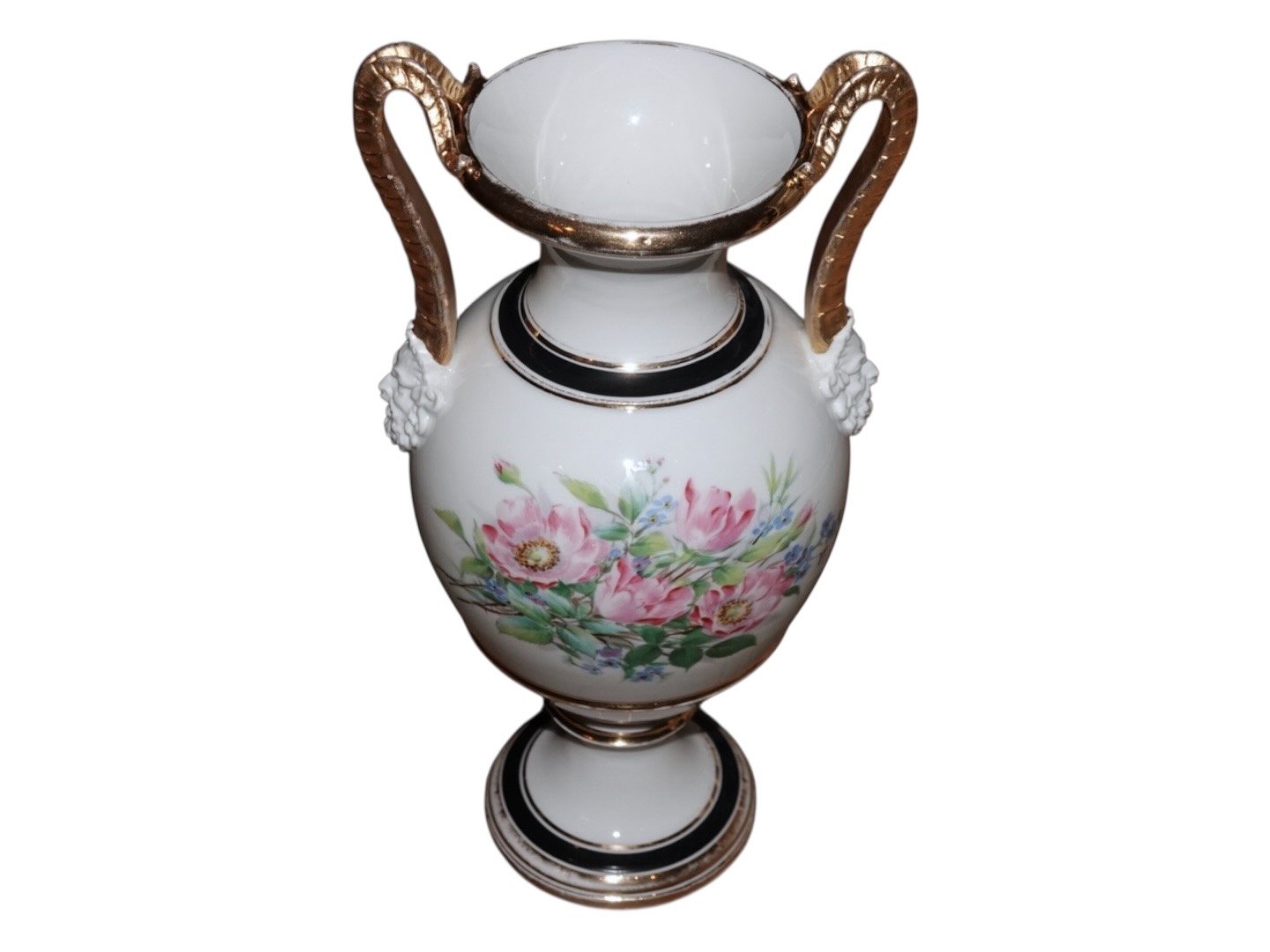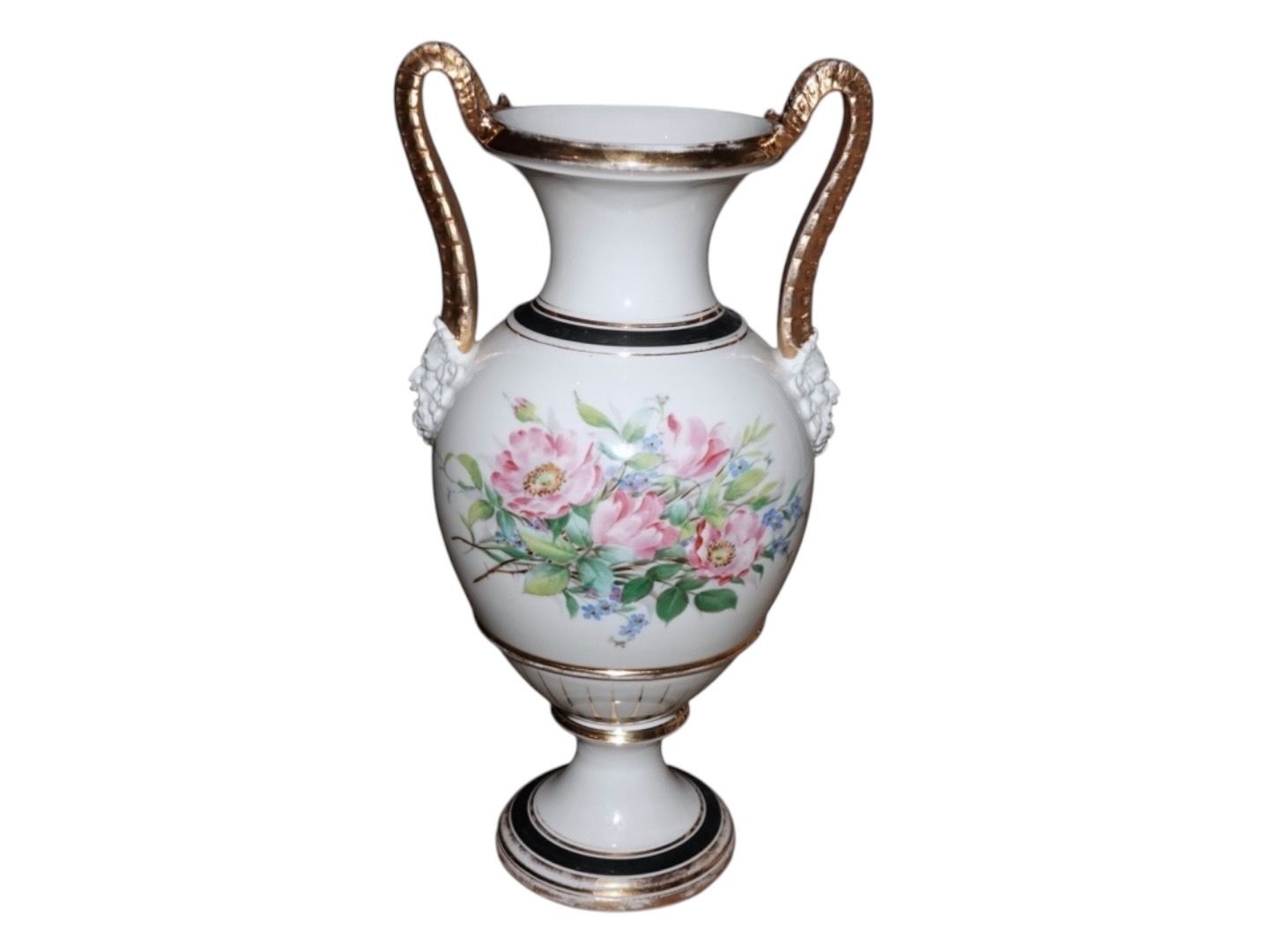 Tall and antique Bing & Grondahl vase decorated with pink wild roses.