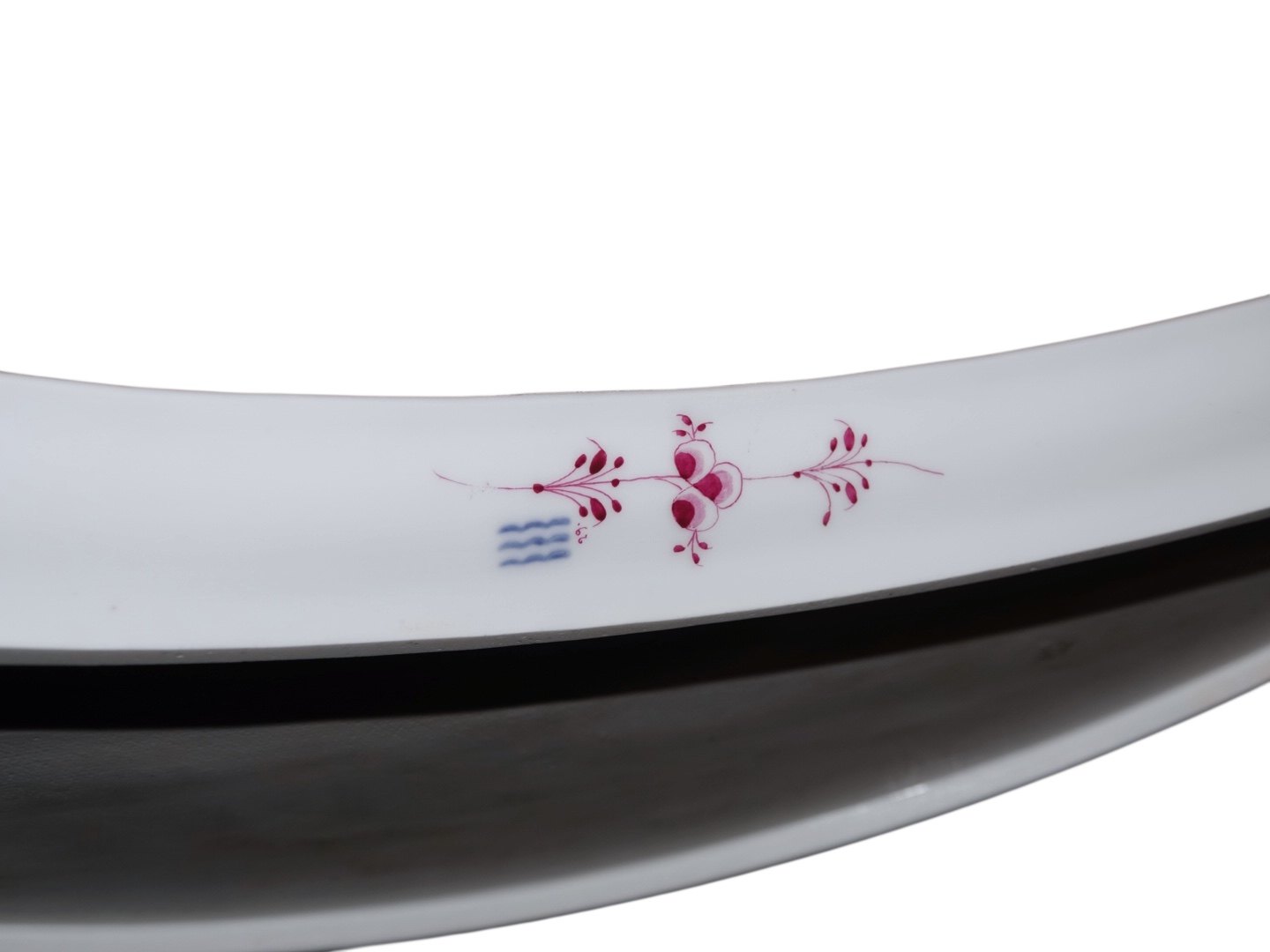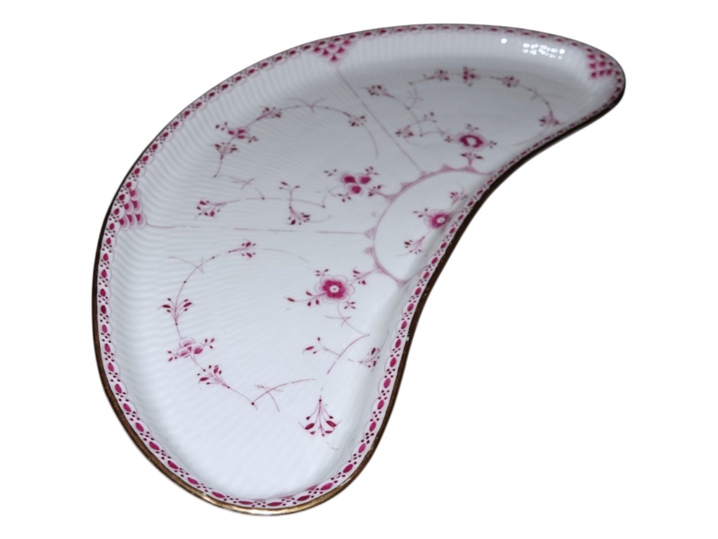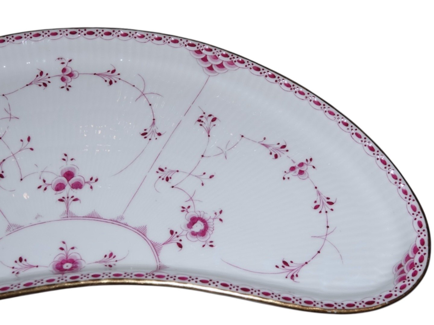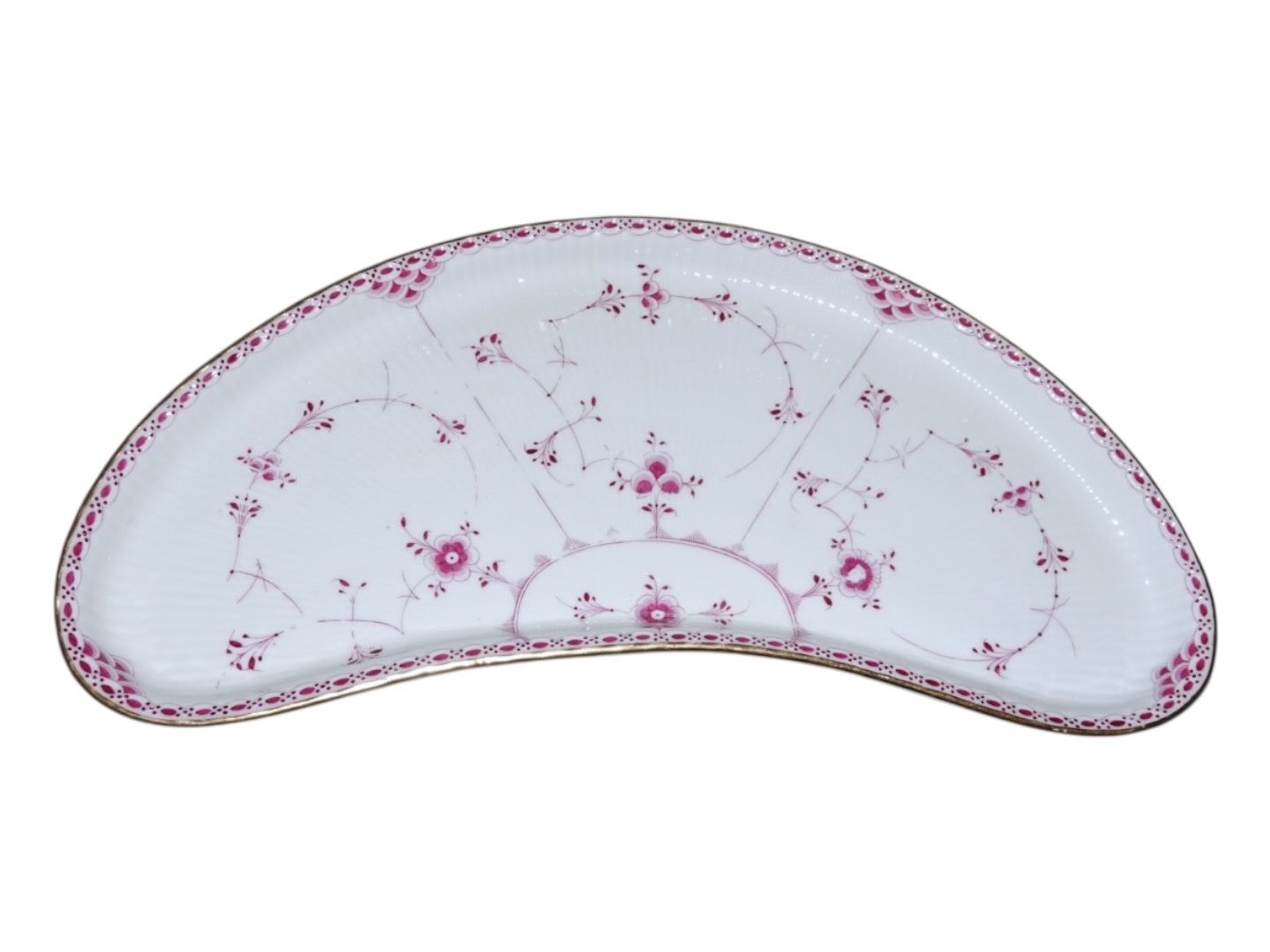 Royal Copenhagen Blue Fluted Pink Half Lace with gold ege, very large and rare moon shaped platter.