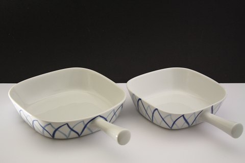 Harlekin/Blå flamme Dan-ild Lyngby. Design Axel Brüel i 1958. Ildfast porcelæn blev solgt under sloganet fra ild til bord.Pande 18x19,5 cm. Højde 5 cm. Pris: 100 kr. stk. Lager: 3