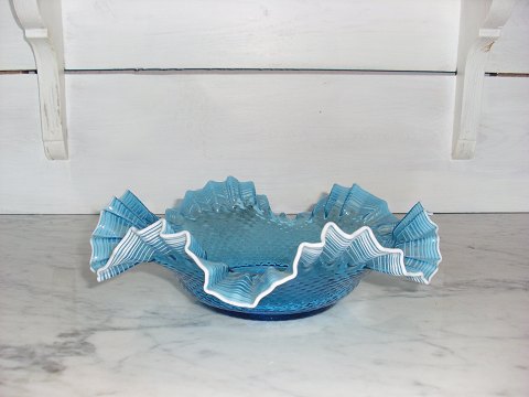 Visitkortskål. Fyens Glasværk. Ca. år. 1900. Lyseblå med hvid stribet kant. Udstiller