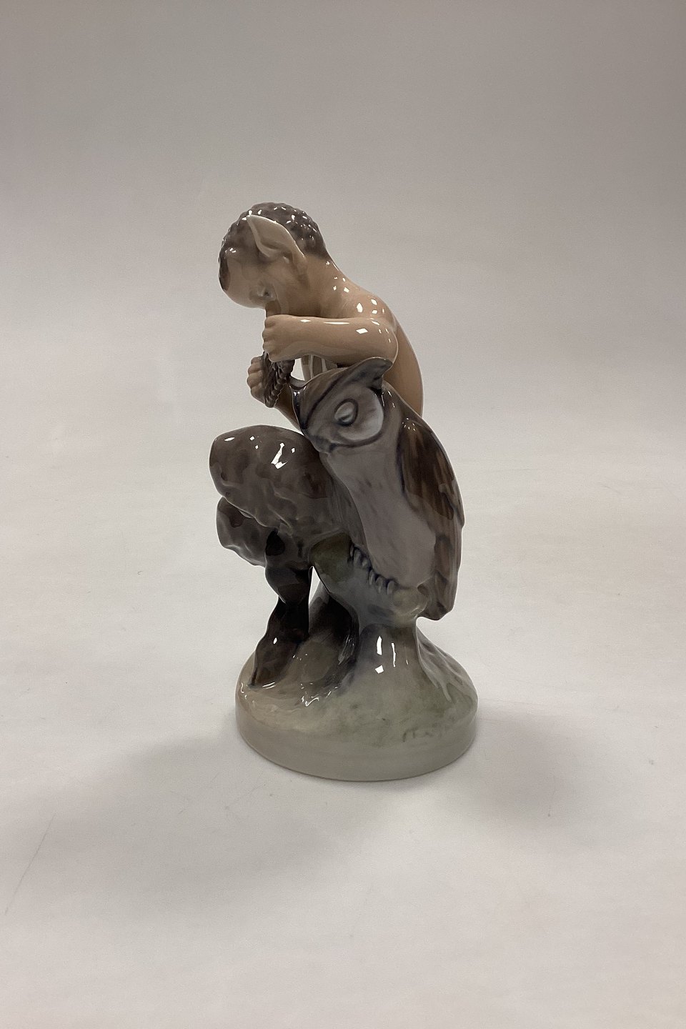 Royal Copenhagen Figurine Faun with Owl No. 2107. Designed by Chr. Thomsen in 1920.Measures 16 cm x 11 cm / 6.29 in. x 4.33 in. 1st Quality.