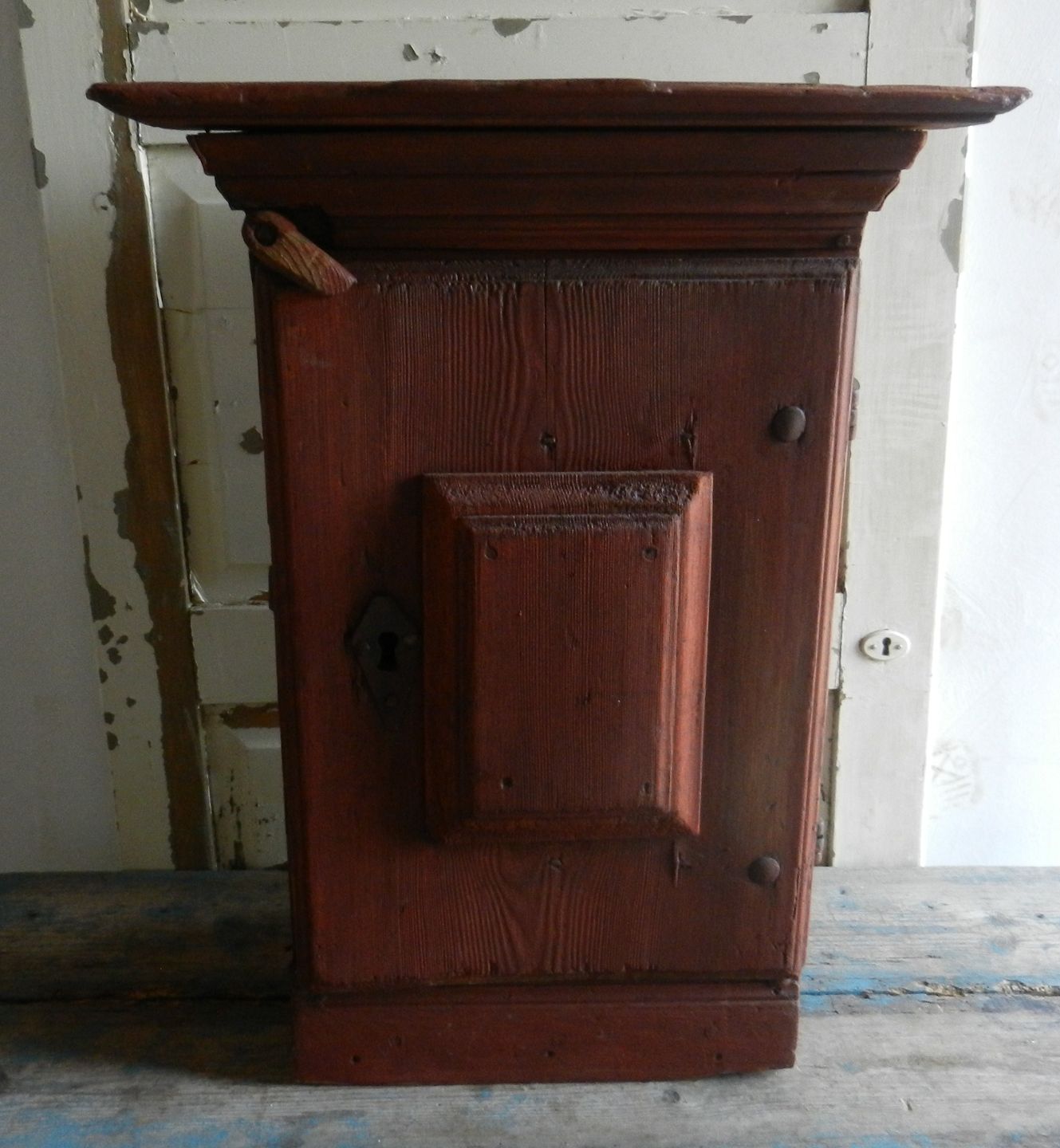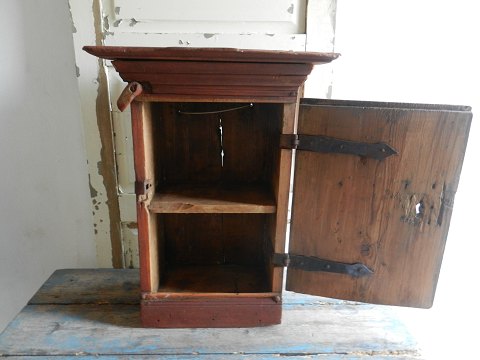 1700tals hængeskab, fremstår med original maling og skøn patina. Låsen mangler!Mål 28x46cm. Højde 62cm.