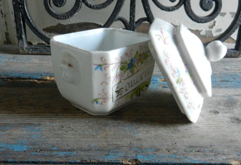 Fransk 1800tals sukker skrin, dekoreret med blomster og tekst Suiwenir, bliver også kaldt nonne porcelæn.Mål 8x11cm. Højde 13cm.