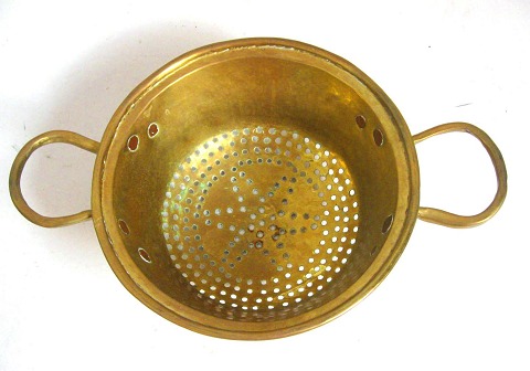 Dørslag i messing, 19. årh. Med hanke. Huller i bund i stjernemønster. Dia.: 22 cm. L.: 34 cm.Emne nummer: 4610