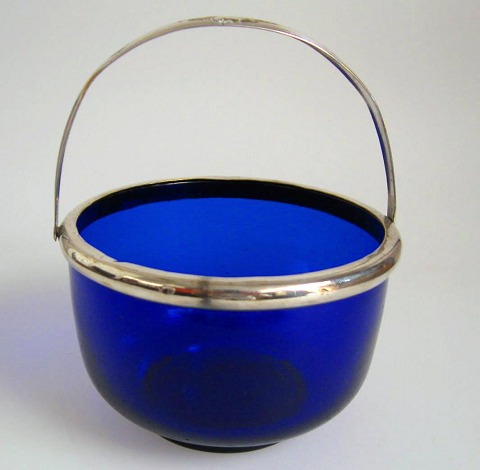 Antik sukkerkumme, England, 19. årh. i kobolt blåt glas med hank i forsølvet messing med dekorationer. Højde med hank.: 15 cm. Dia. 12 cm.Emne nummer: 4629