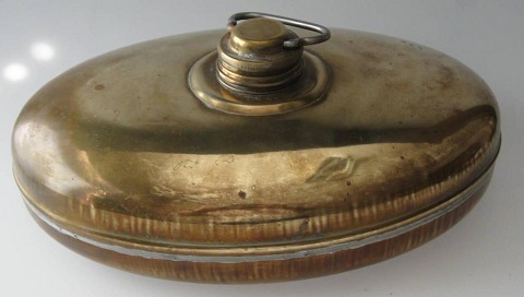 Varmedunk i messing, 19. årh. Danmark. Oval. Med skruelåg. L.: 27 cm.