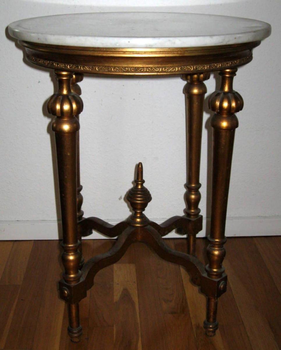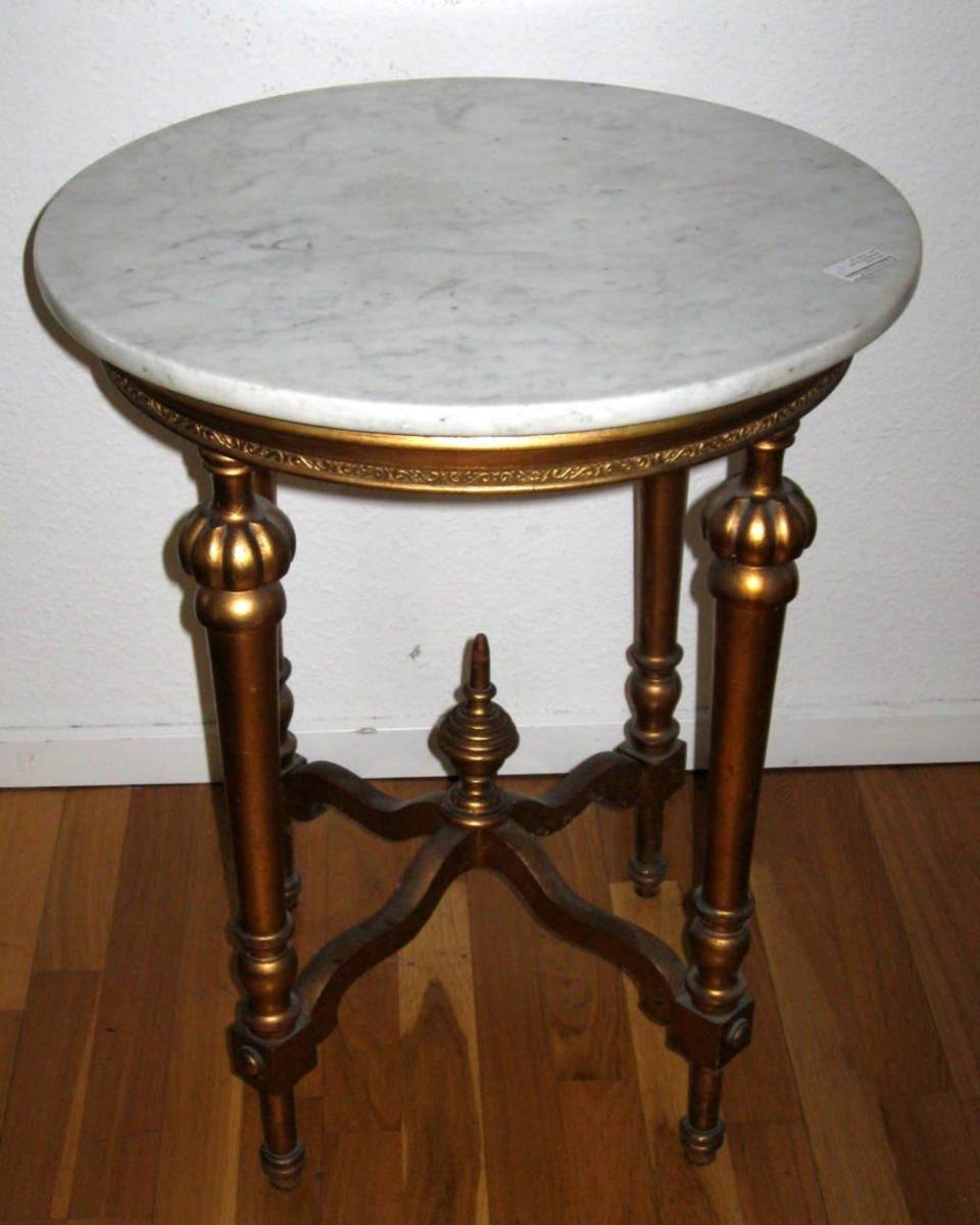 French gilded table with marble plate, 19th century. Twiated legs with decorations. Edge Decoration. H: 72 cm. Dia. plate: 58 cm.Item number: 5771