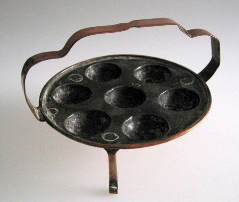 Antik æbleskivepande i kobber, 1842. På trefod med hank. Til 7 æbleskiver. Indvendig fortinnet. På hanken følgende inskription: Ane Haldner 1842.Proveniens.: Sønderjysk familie.