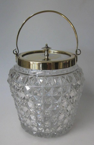 Engelsk bisquitspand, o. 1900, i klart glas. I bunden stemplet med mærket.: Rd 45942. Med låg og hank i messing - tidligere forsølvet. Højde.: 15 cm. Højde med hank.: 23 cm.Emne nummer: 8037