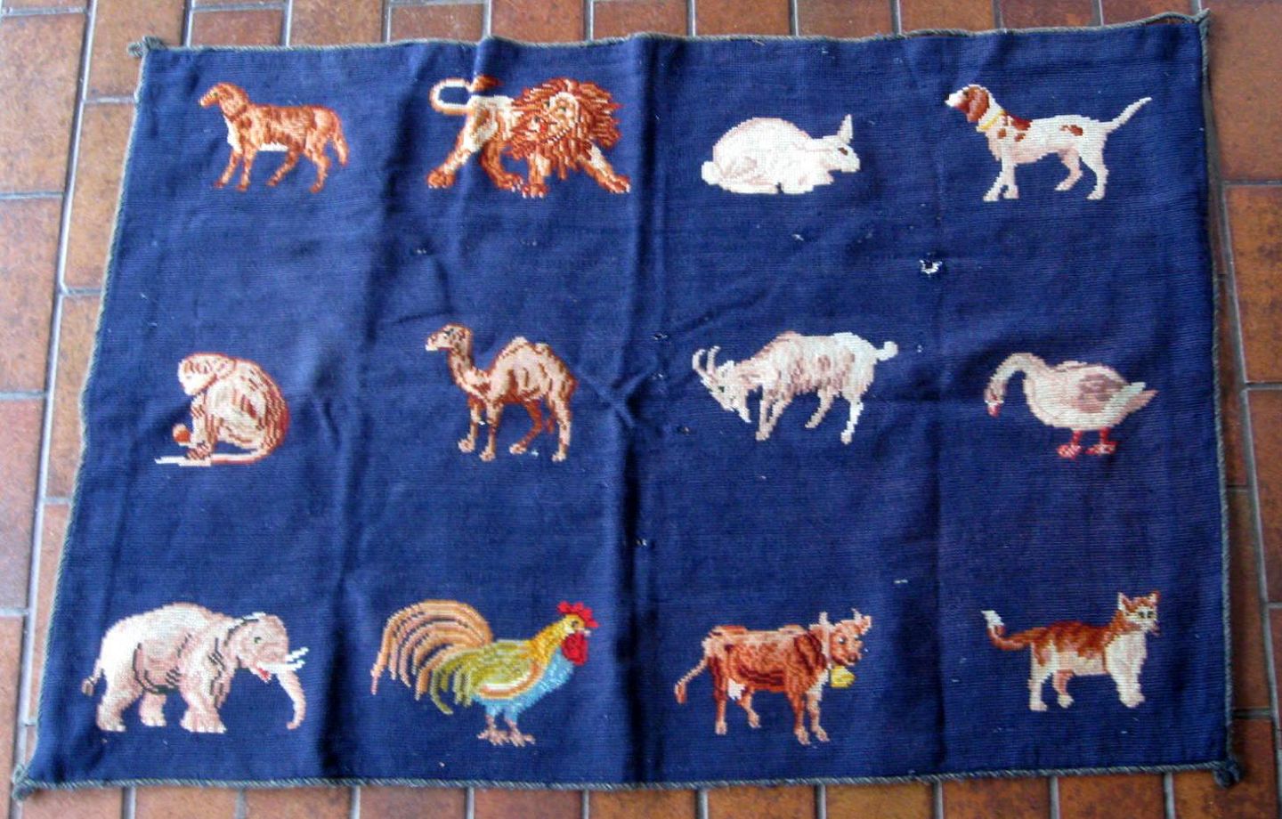 Antikt vægtæppe, Stramaj, 19. årh. fra Sønderjylland. Dekoreret med bl.a. elefant, kamel, abe, ko, kat m.v. 130 x 88 cm. Blå bund med farver. Med mindre defkter.Emne nummer: 8319
