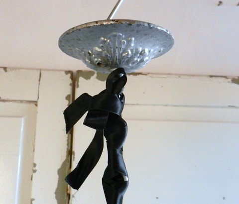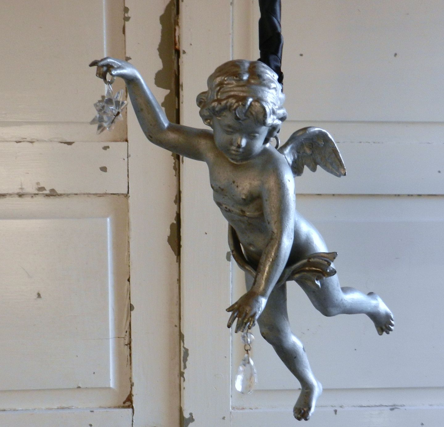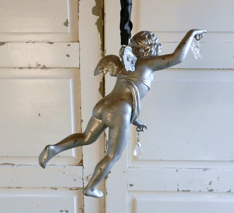 Meget smuk engel i sølv bronzeret metal. Englen holder en stjerne og en dråbeformet prisme i hænderne, den hænger i en kæde der er om viklet med sort silkebånd.Længde på selve englen 35cm.
