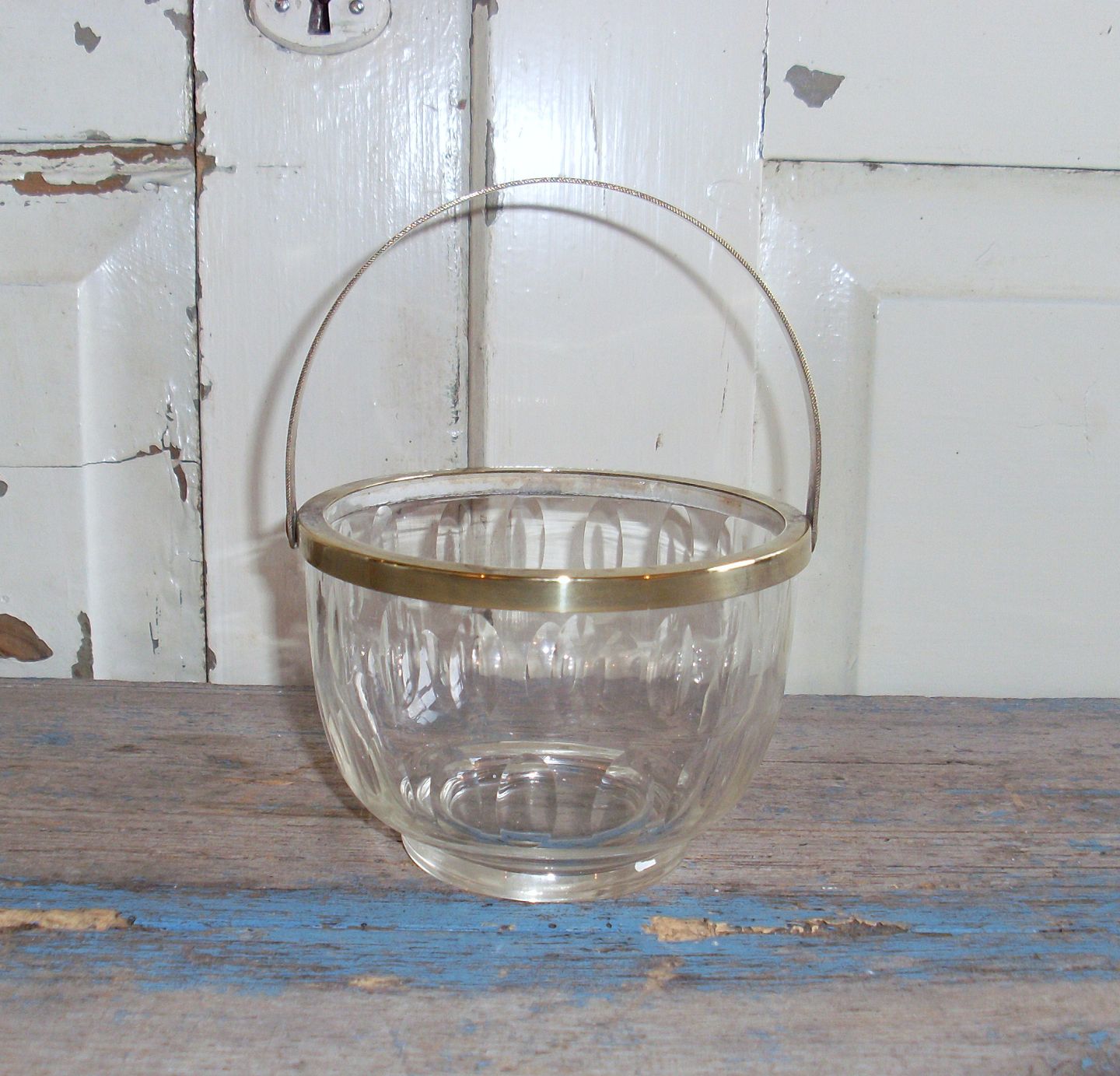 Sukkerskål i klart glas med oliven slibninger, monteret med forsølvet hank stemplet de to tårne.Den forsølvede hank fremstår meget afpudset.