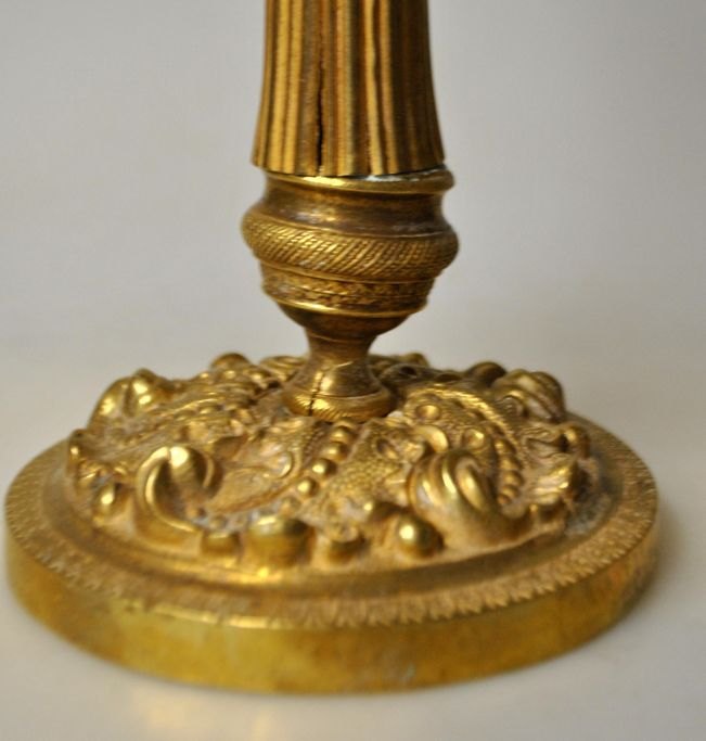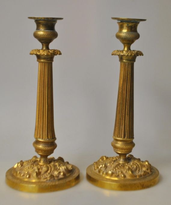 Pair of French candlesticks in brass / bronze, ormelue, 19th century. Foot with rococo decorations. H: 24 cm.Item number: 12287