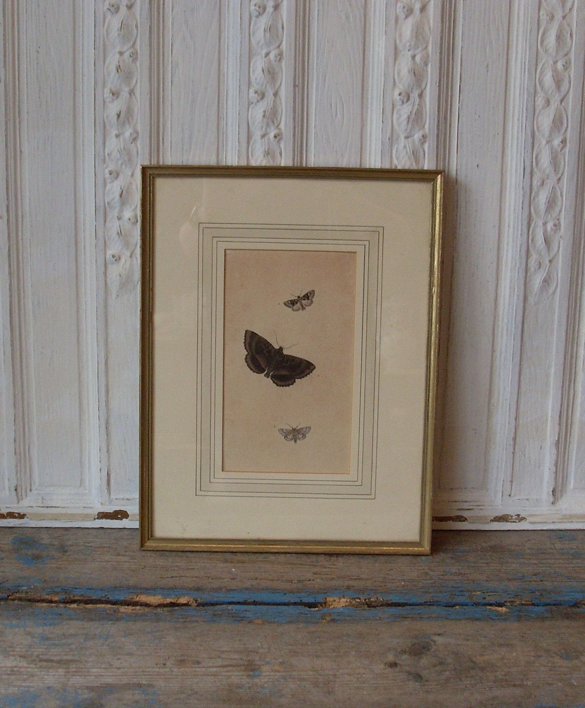 1800tals håndkoloreret tryk med sommerfugl i smuk enkel guldramme.Mål 26x33,5cm.