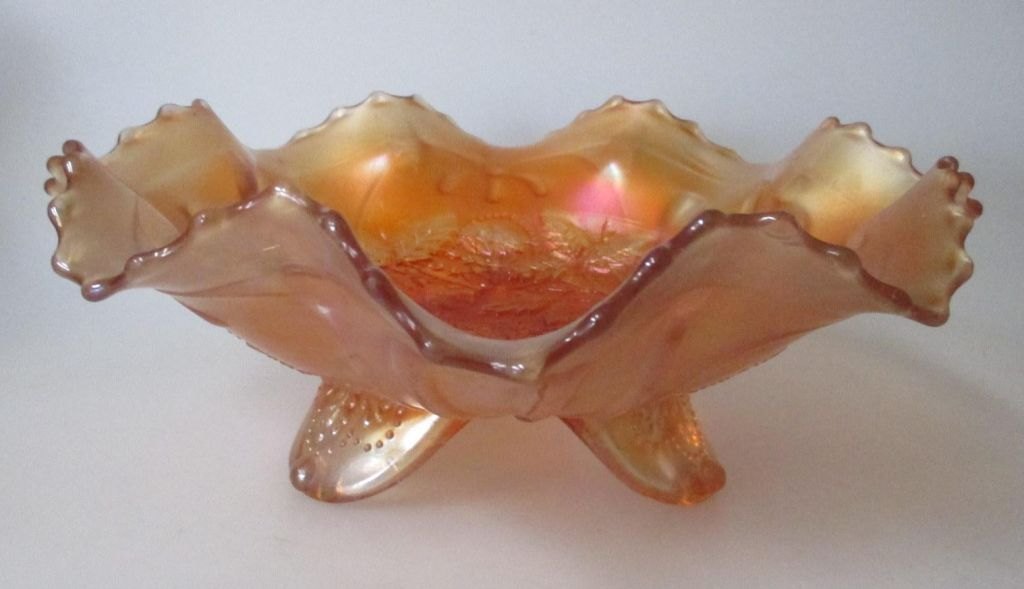 Amerikansk presset glas skål, orange irriseret, 20. årh. Dekoreret med blad og kirse bær. Flæset kant. Dia.: 22 cm. H.: 8,5 cm. Perfekt stand!Emne nummer: 17651