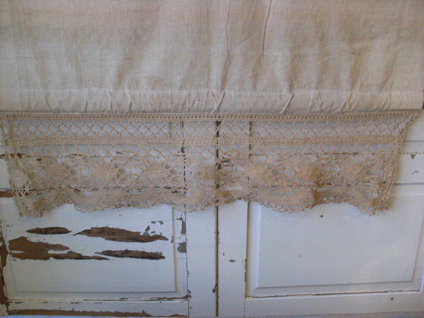 Gammelt vintage rullegardin med hæklet kant.Total bredde 112cm. Stoffets bredde 105cm.