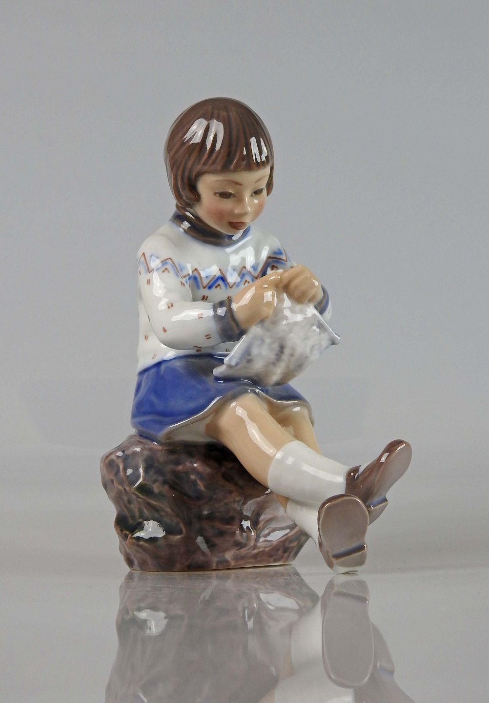Figur af strikkende pige i blå kjole og strikketrøje siddende på sten af Dahl Jensen nr. 11971. sortering, arkivfoto