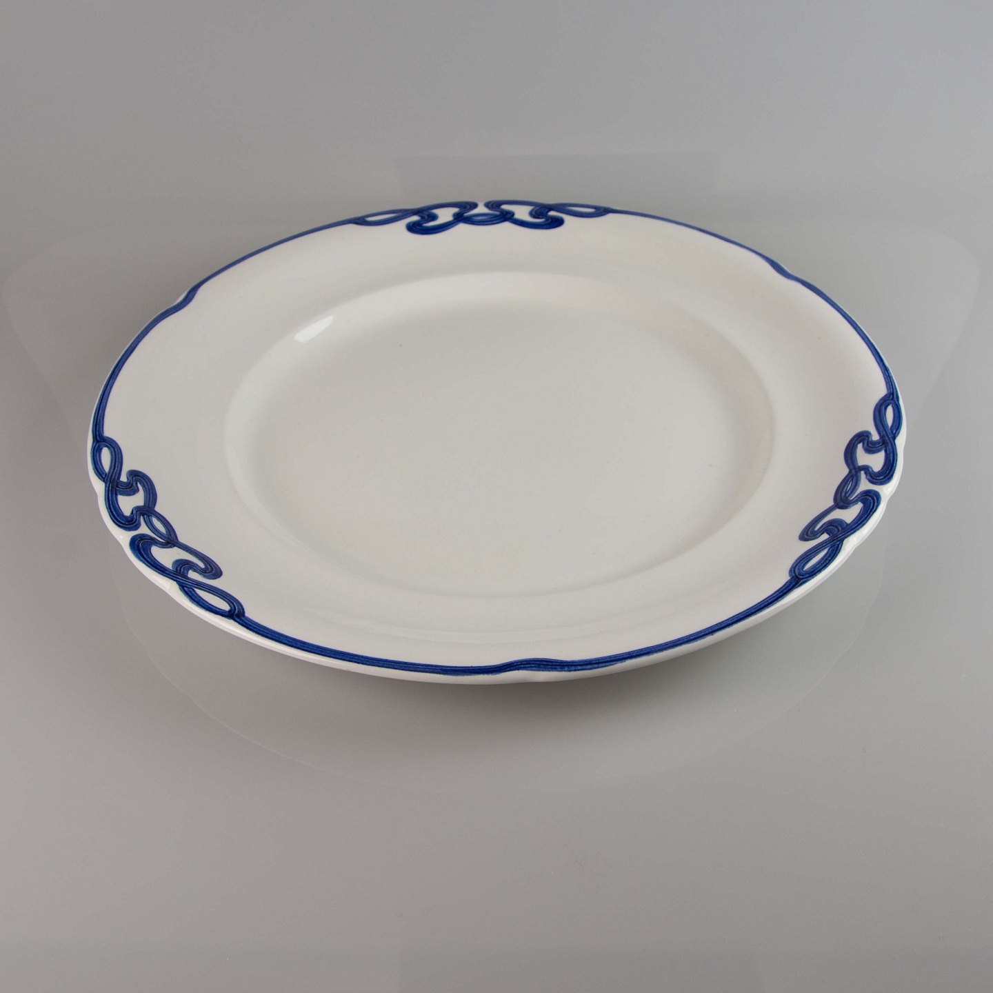 Fad i hvid fajance med dekoration af blå abstrakt mønster langs kanten.