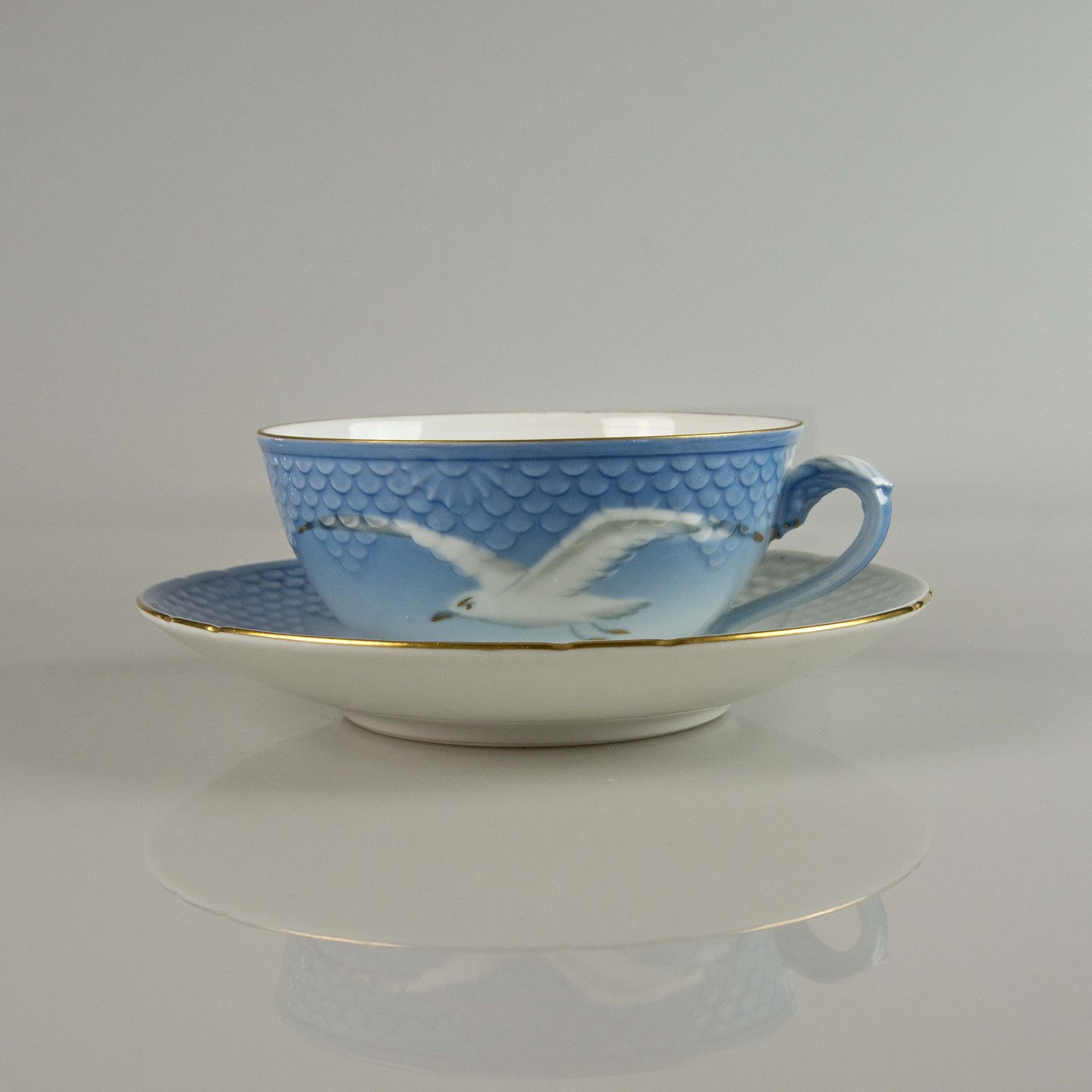 Stor kop i hvid og blå porcelæn med dekoration af flyvende måge.