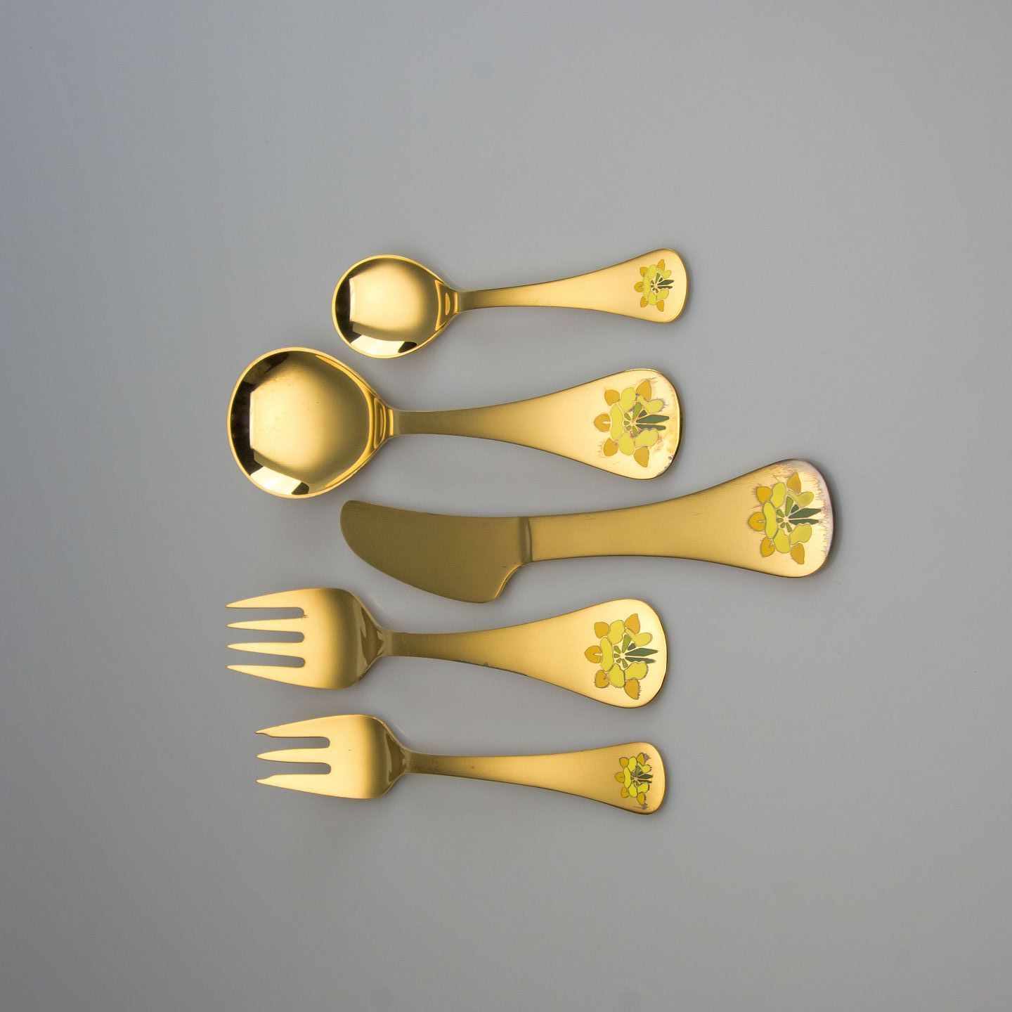 Bestik i forgyldt sølv fra år 1991 med blomstermotivet KællingetandDesign af Annelise Bjørner