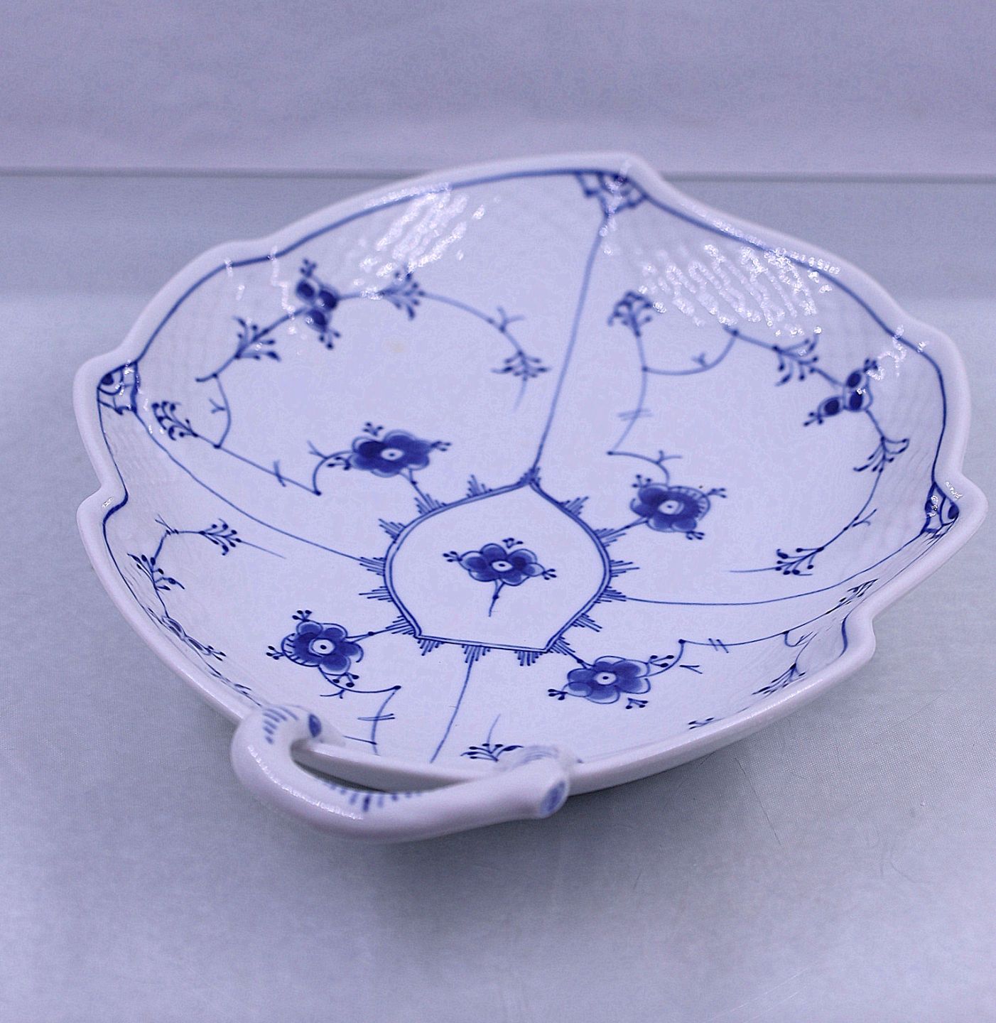 Bladformet fad f porcelæn fra stellet Blåmalet. Nr. 199.Musselmalet fad med skelkant.