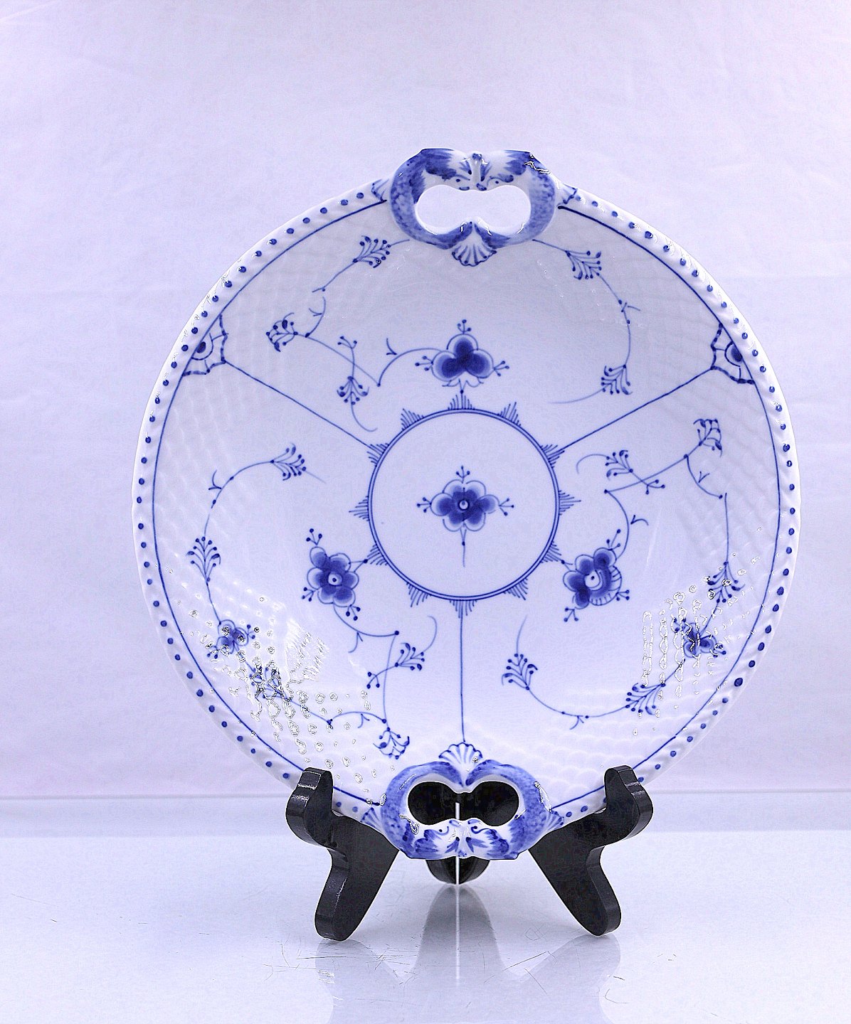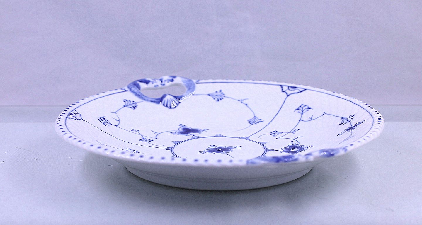 Rundt kagefad af porcelæn fra stellet Blåmalet. Nr. 101Musselmalet fad med skelkant.