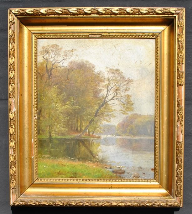 Aagaard, Carl Frederik (1833 - 1895) Denmark .: A boat on a lake - spring. Signed 1893. Oil on canvas. 28 x 23.5 cm. Framed. 38 x 34 cm.Item number: 22724