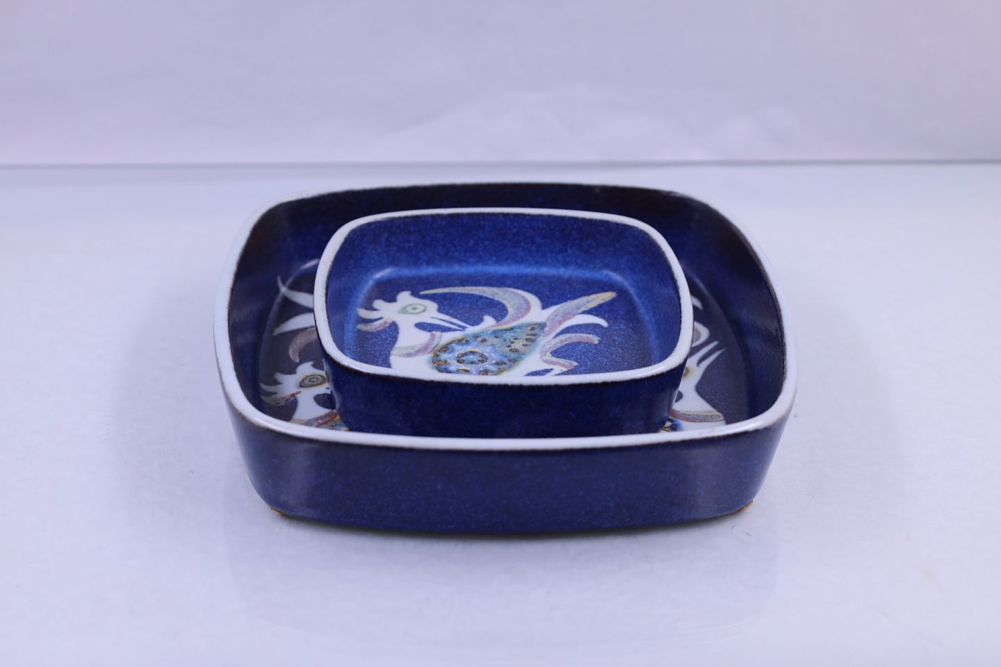 Kgl. Blå Baca fajance fade. Firkantet fade med fuglemotivDesign Nils Thorsson