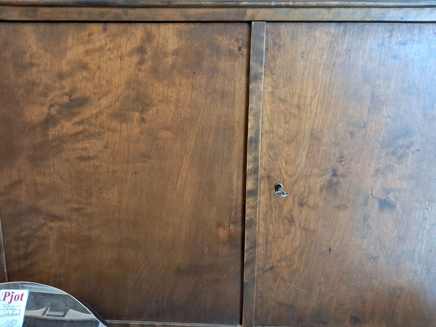 Dækketøjsskab i fineret og bejset birketræ fra 1930erne.Det har brugsspor.