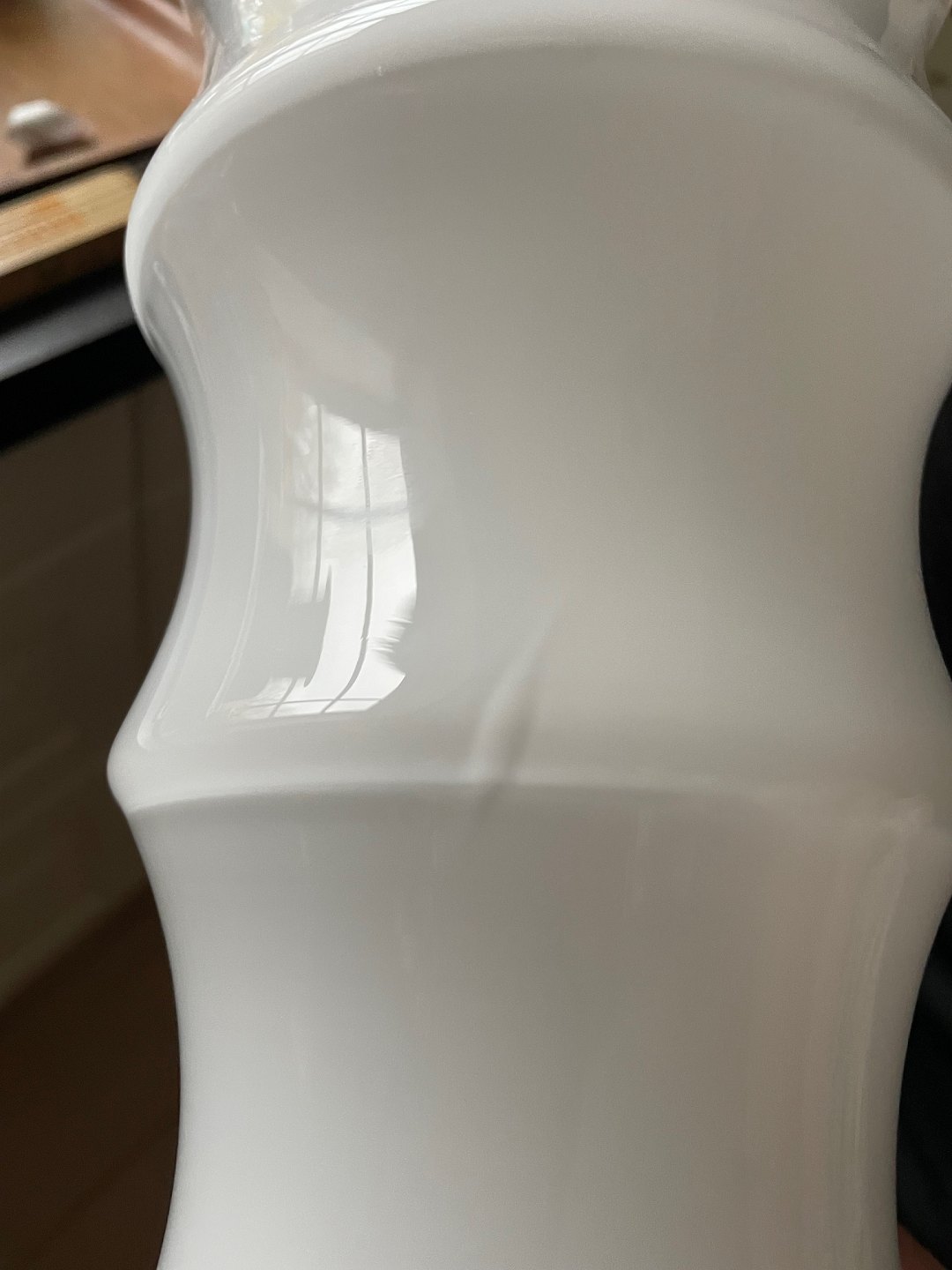 Holmegaard, Karen Blixen opalinehvid vase stor størrelse. Designet af Anja Kjær i 2000. Vasens form er inspireret af afrikanske kvinders hals og armringe. Højde 30,5 cm. Diameter 17,5 cm. OBS der er 2 indvendige produktionsfejl. Den øverste som en revne i glasset, den nederste som en boble, den kan ses udefra. Pris: 400 kr. stk. Lager: 1 Dealer