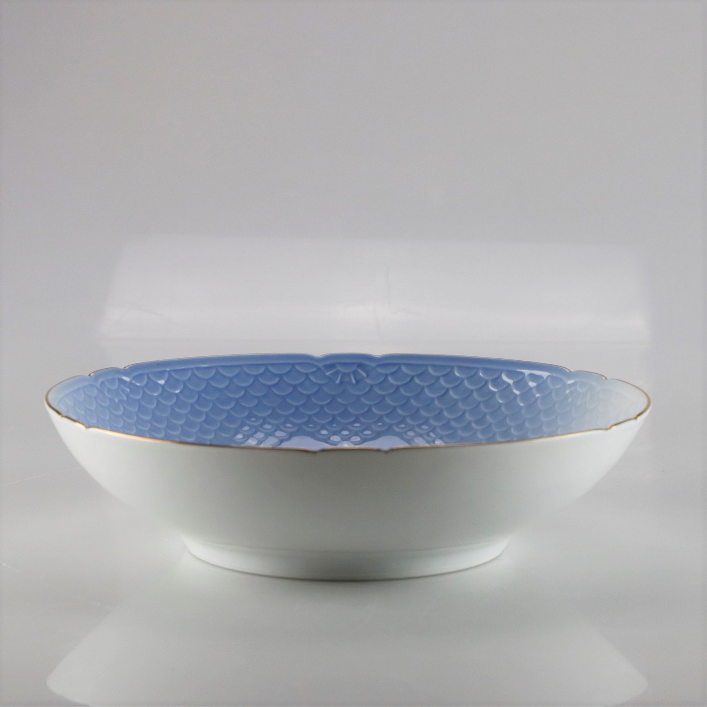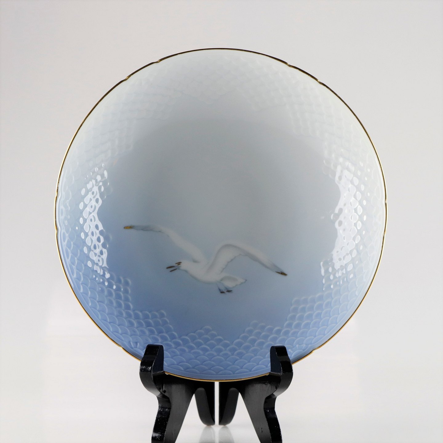 Porcelænsskål i hvid og gradueret blå nuancer med guldkant og dekoration af måge