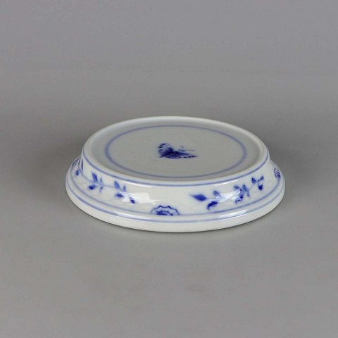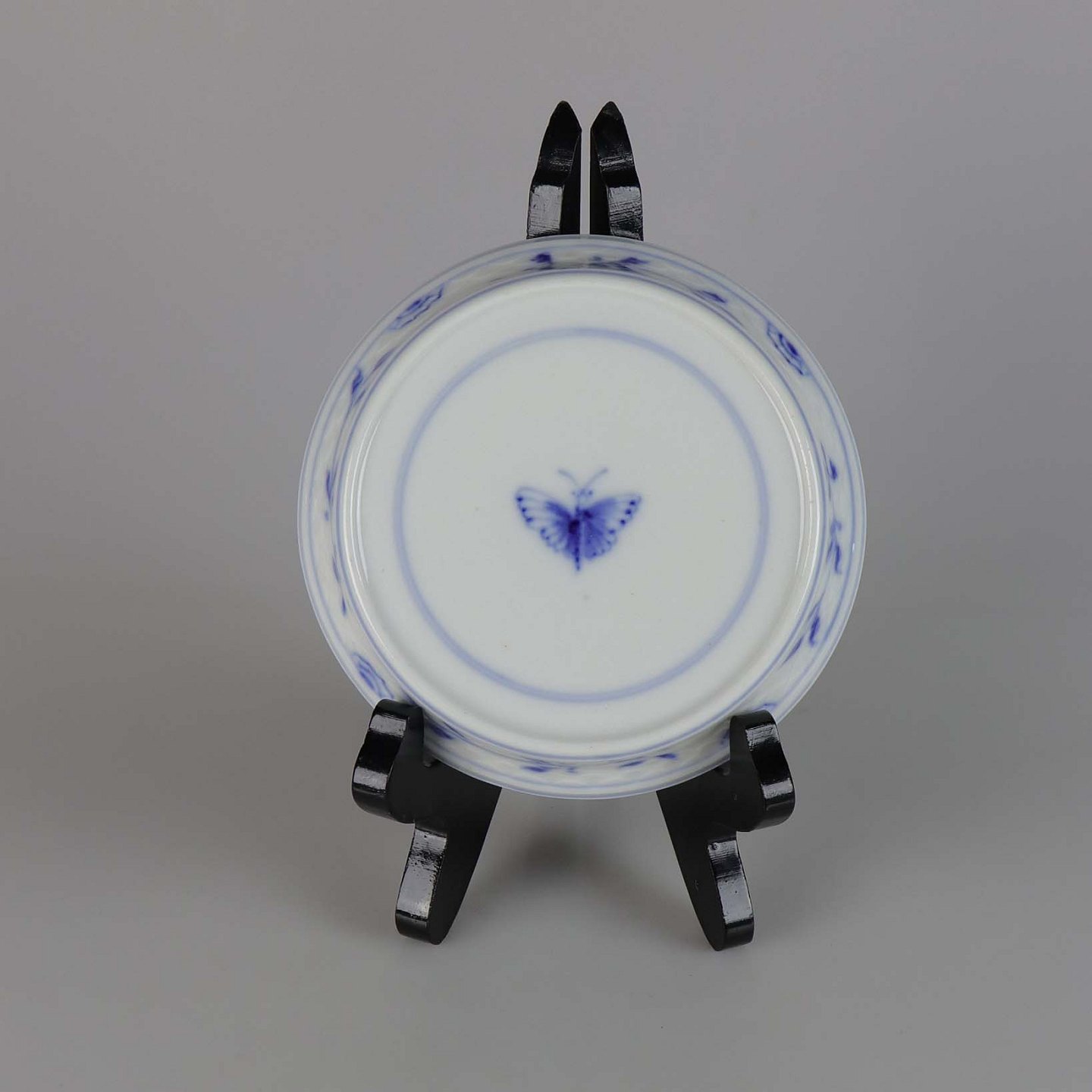Skåner i hvidt porcelæn med blå motiver af blomster og sommerfugle.