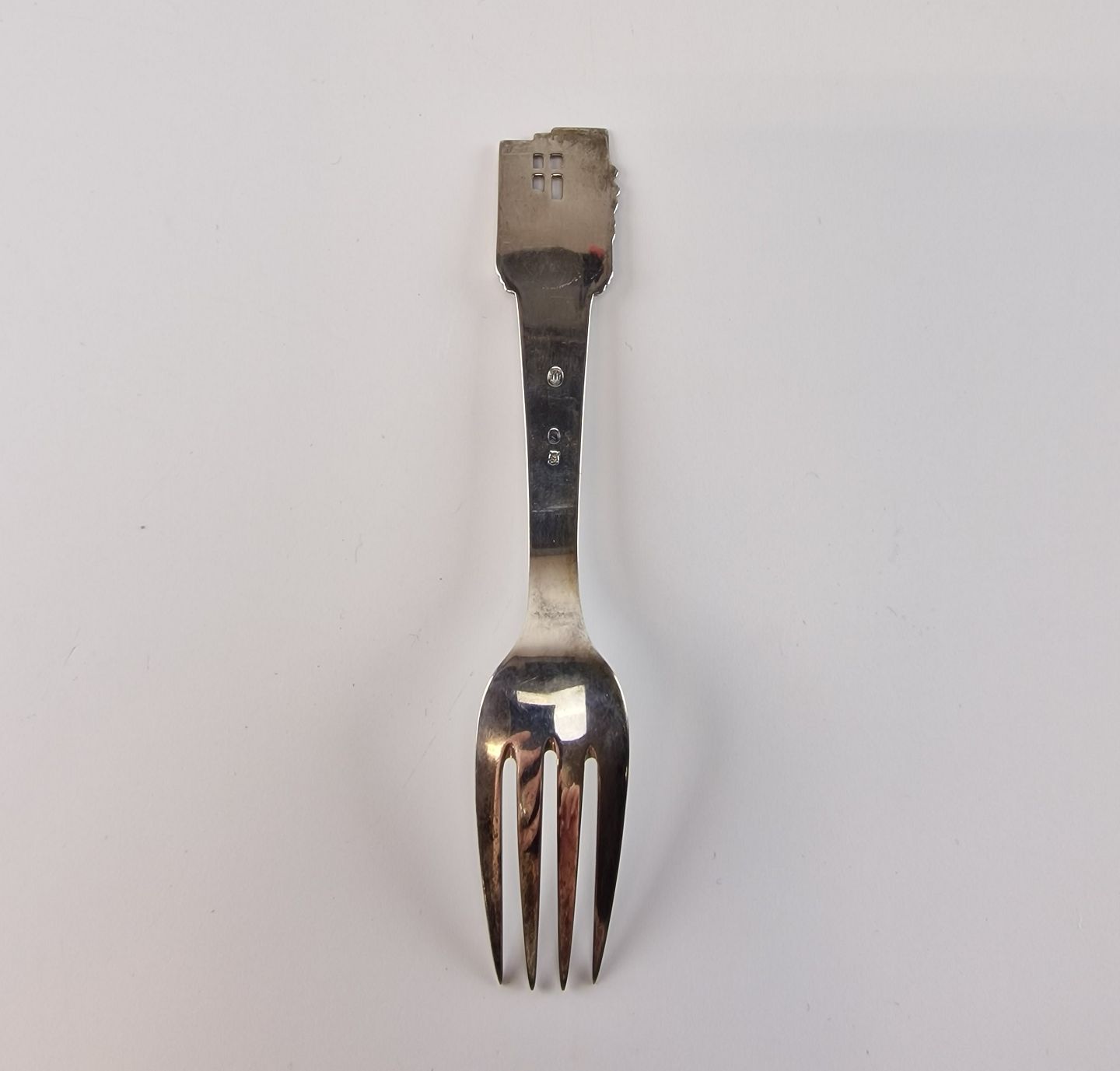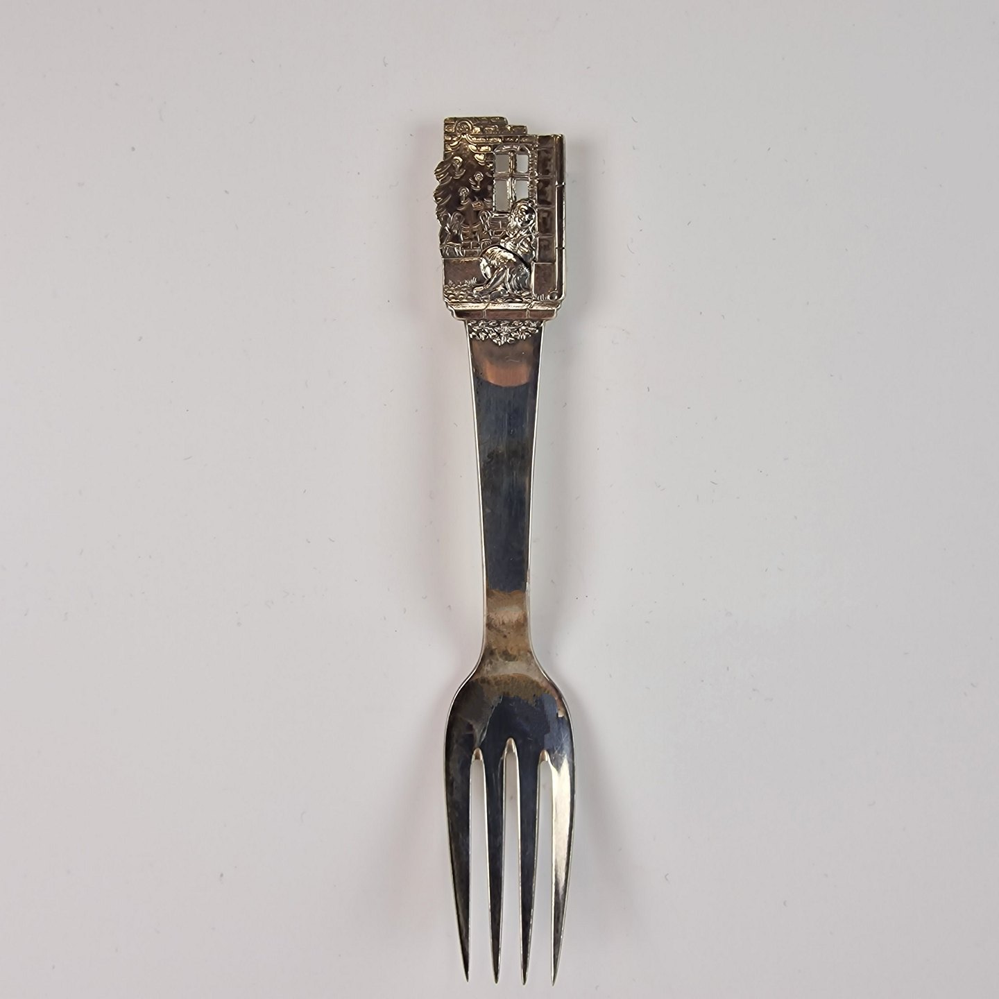 H.C. Andersen barnegaffel i sølv. Med motiv fra eventyret Den lille pige med svovlstikkerne. År 1947Stemplet med 3 tårne og J.S (Sølvguardein Johannes Siggaard 1932 - 1960)